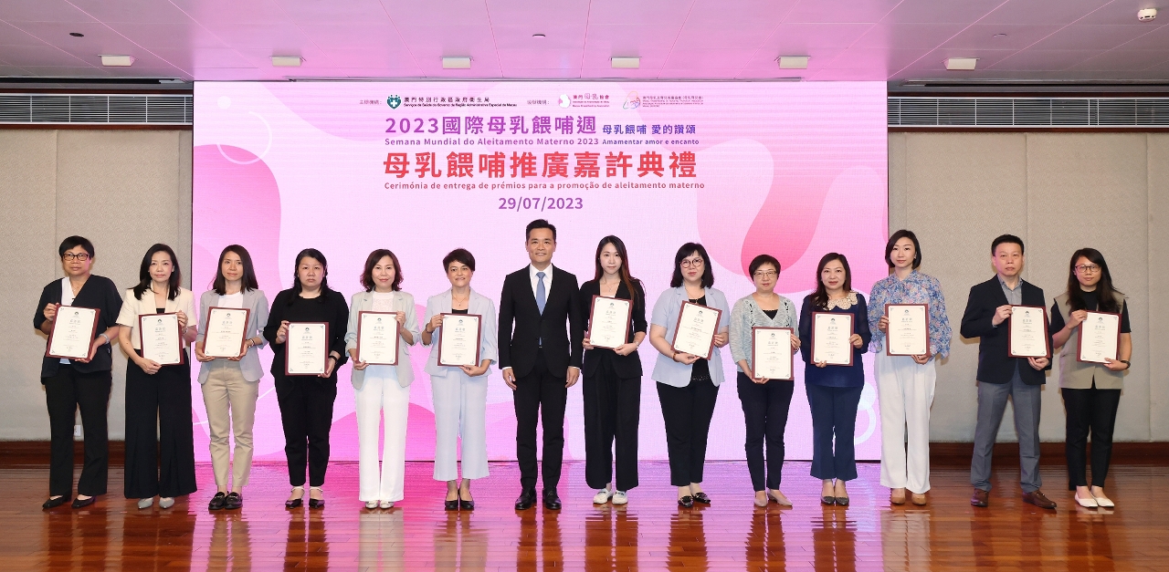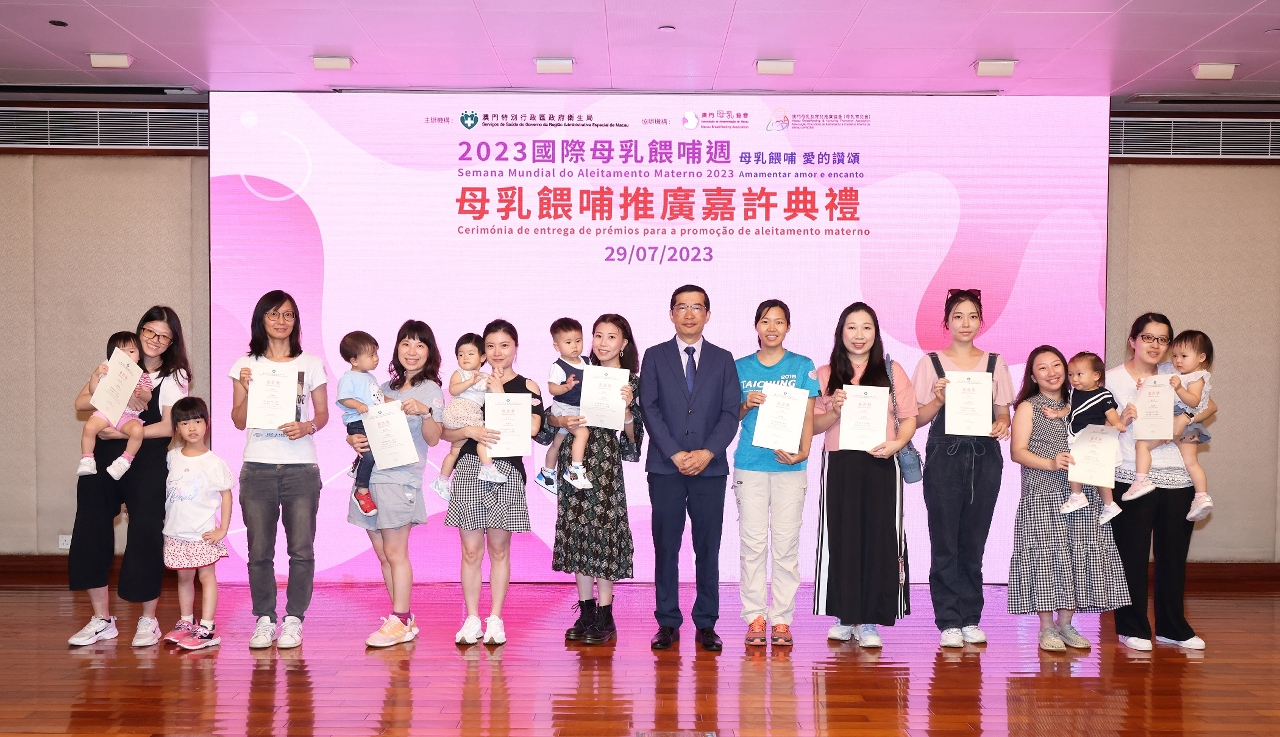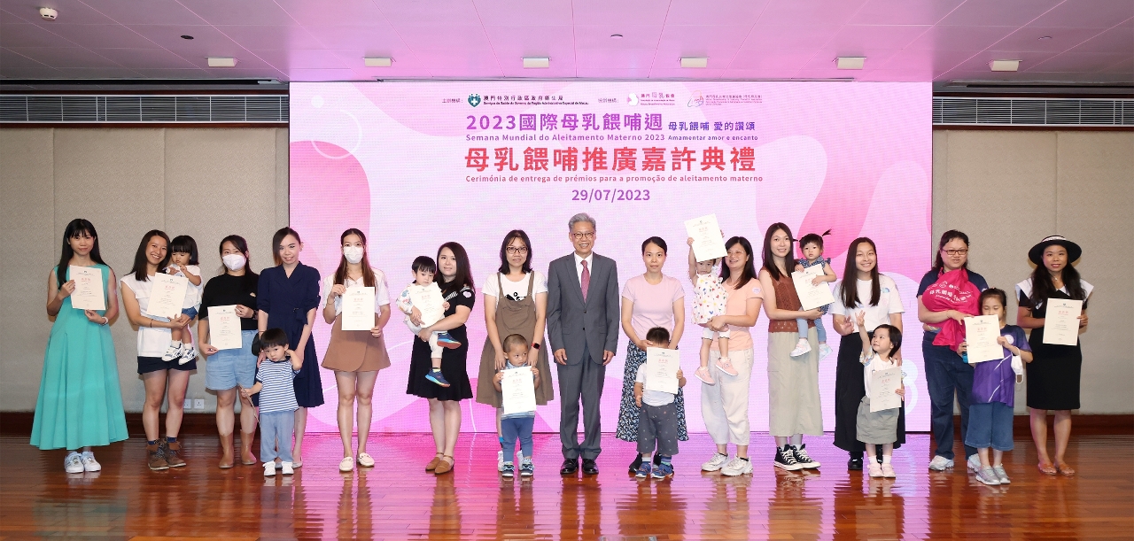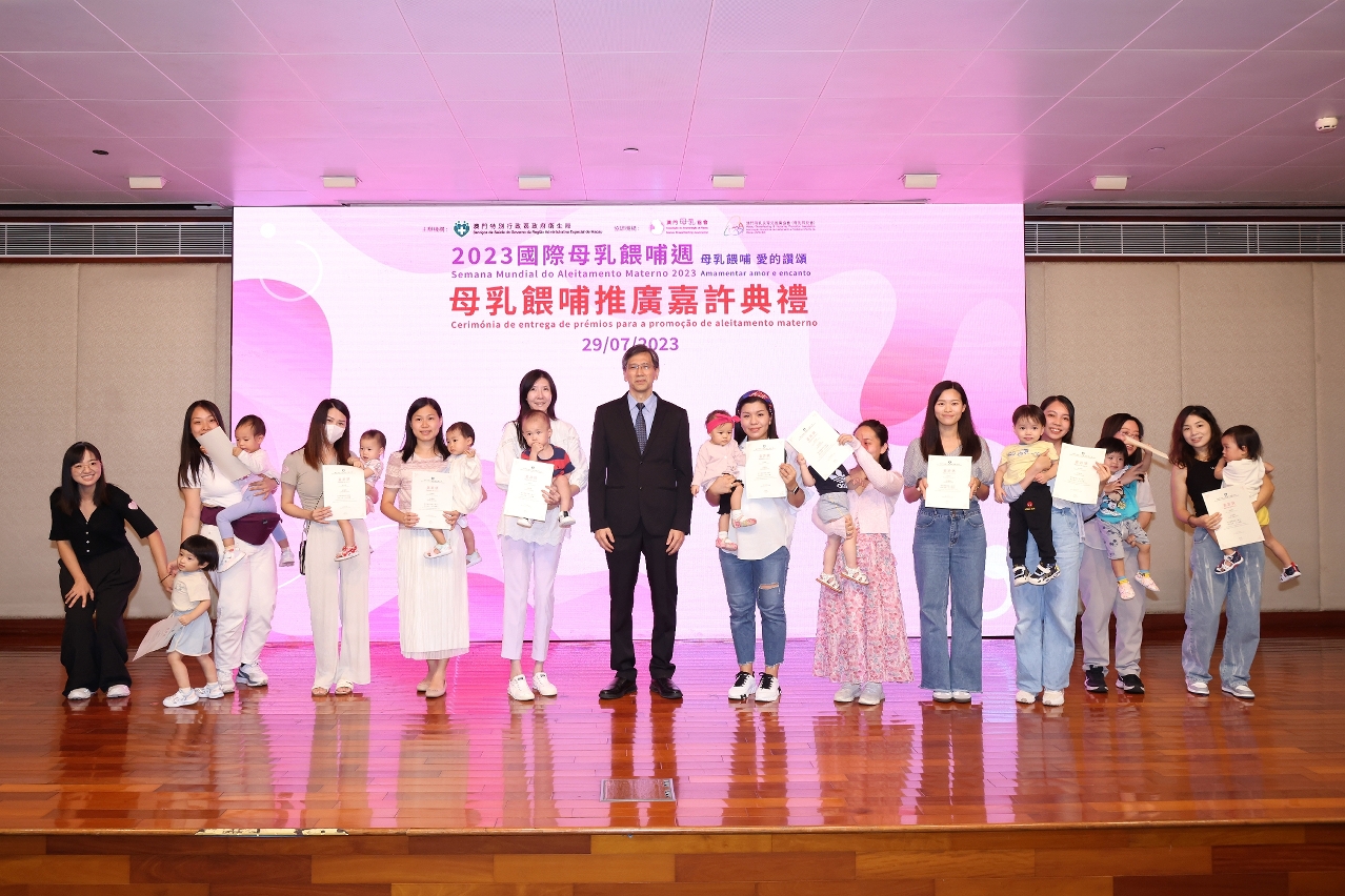 为响应2023年国际母乳喂哺周,由卫生局主办,澳门母乳协会、澳门母乳及育儿推广协会协办的‶2023母乳喂哺推广嘉许典礼″于日前举行,卫生局罗奕龙局长、郭昌宇副局长、郑成业副局长、梁基雄代副局长及多个公私营机构、学校代表等出席典礼,还有44个家庭,约200多人参加是次活动。今年获得颁发嘉许状的公、私营机构共196间,获颁发嘉许状的学校共6间;另分别有245位母乳喂哺的妈妈获得嘉许。