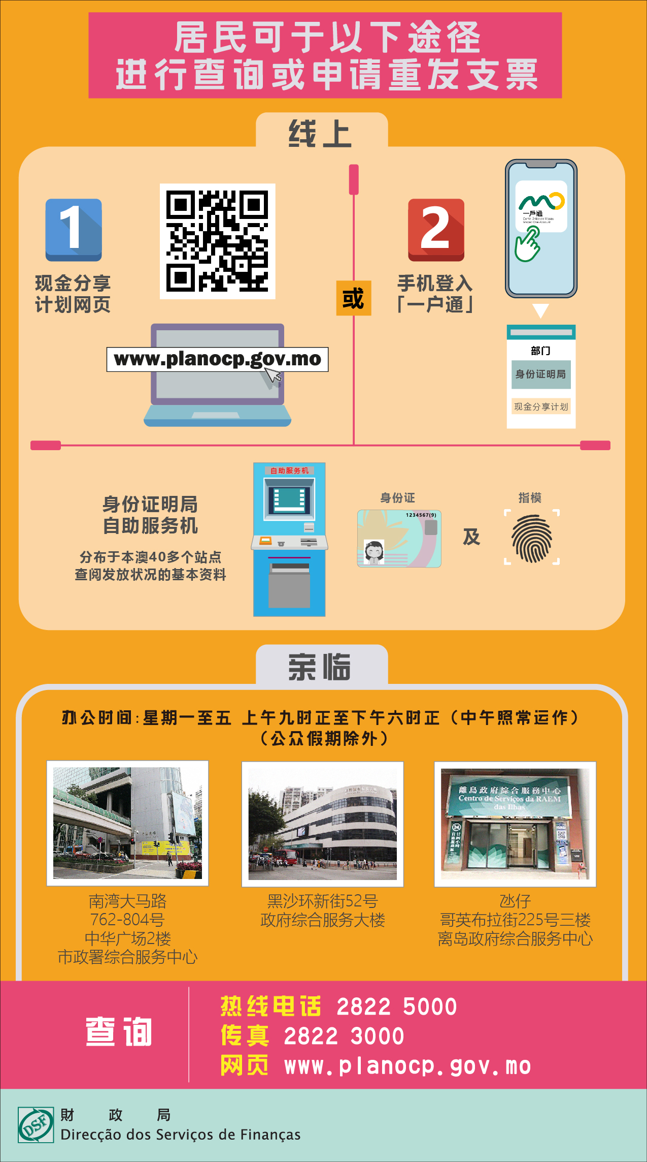 为配合计划的实施,居民可透过现金分享计划网页www.planocp.gov.mo或澳门公共服务一户通查询款项派发详细资料及支票重发,亦可使用身份证明局分布于本澳40多个站点的自助服务机,查阅发放状况的基本资料。