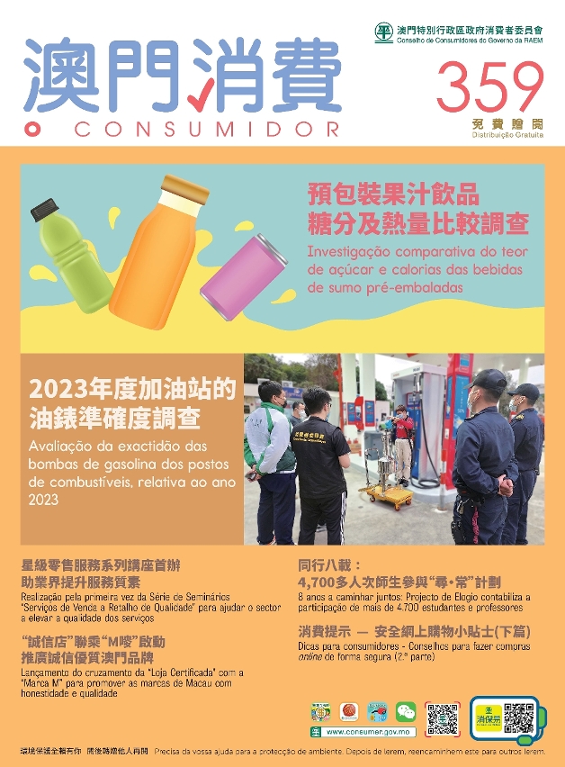 第359期《澳门消费》公布预包装果汁饮品糖分及热量比较调查,以及2023年度加油站油表准确度调查,介绍消费者委员会分别与旅游局、澳门生产力暨科技转移中心及澳门厂商联合会近期开展的协作项目。