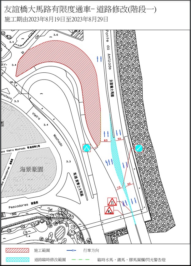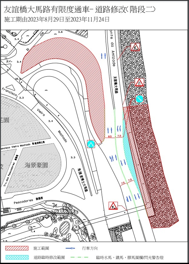配合新城填海A区与澳门半岛连接桥(A2) 建造工程的桩基础及桥身施工需要,近友谊大桥的一段友谊桥大马路于2023年8月19日至11月24日临时调整行车路形,届时友谊桥大马路维持现时双向4线行车, (详见附图),请驾驶者留意现场交通指示标志或遵守现场交通警员的指挥及安排。