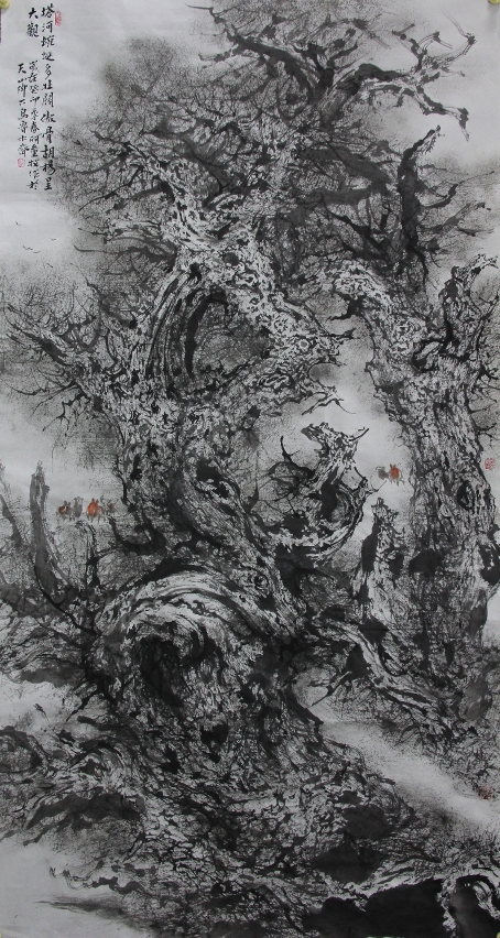胡杨是地球上最早的物种之一,诞生在1亿年前的白垩纪时代。现蛰居在新疆塔里木河流域,以及同纬度的甘肃、内蒙古、中亚细亚等地荒漠。胡杨“活而不死一千年,死后不倒一千年,倒后不朽一千年”。这次展览由策展人、着名作家、艺术评论家孤岛策展,共展出了阿童牧的胡杨国画作品近100幅,其中主题画88幅,还有一些超幅胡杨国画,尤其是画家专门带去展出了一幅长5.4米、高1.8米的巨幅胡杨国画《伊吾胡杨赞》,此画只有黑白两色,但那一群群死而不倒、倔强昂扬的粗大、枯秃的胡杨,姿势横溢,鬼斧神工,出神入化,悲壮而瑰丽,具有巨大的视觉冲击力。