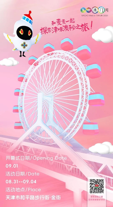 今年第二站 ─ “天津澳门周”将于8月31日至9月4日一连5天在天津市和平路步行街(金街)呈献大型路展,并将于9月1日举行开幕式。路展汇集旅游、商贸、文化、文创、体育及娱乐等特色元素,展现澳门“旅游+”魅力。路展期间定时献上精彩舞台表演,并邀请了天津相声演员带来《欢乐澳门游》相声表演,此外,将在天津交通饭店大楼建筑物的立面上演充满澳门风情的光雕表演。