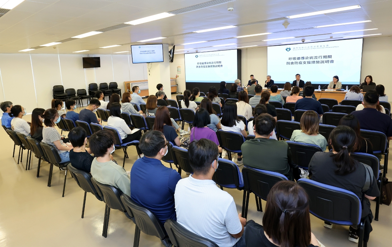 卫生局日前举办“呼吸道传染病流行期间院舍防疫支援措施”说明会,由卫生局罗奕龙局长主持,并邀请社会工作局长者服务处甘洁玲处长列席,超过30多间安老院舍及康复院舍有50多名代表出席参与。