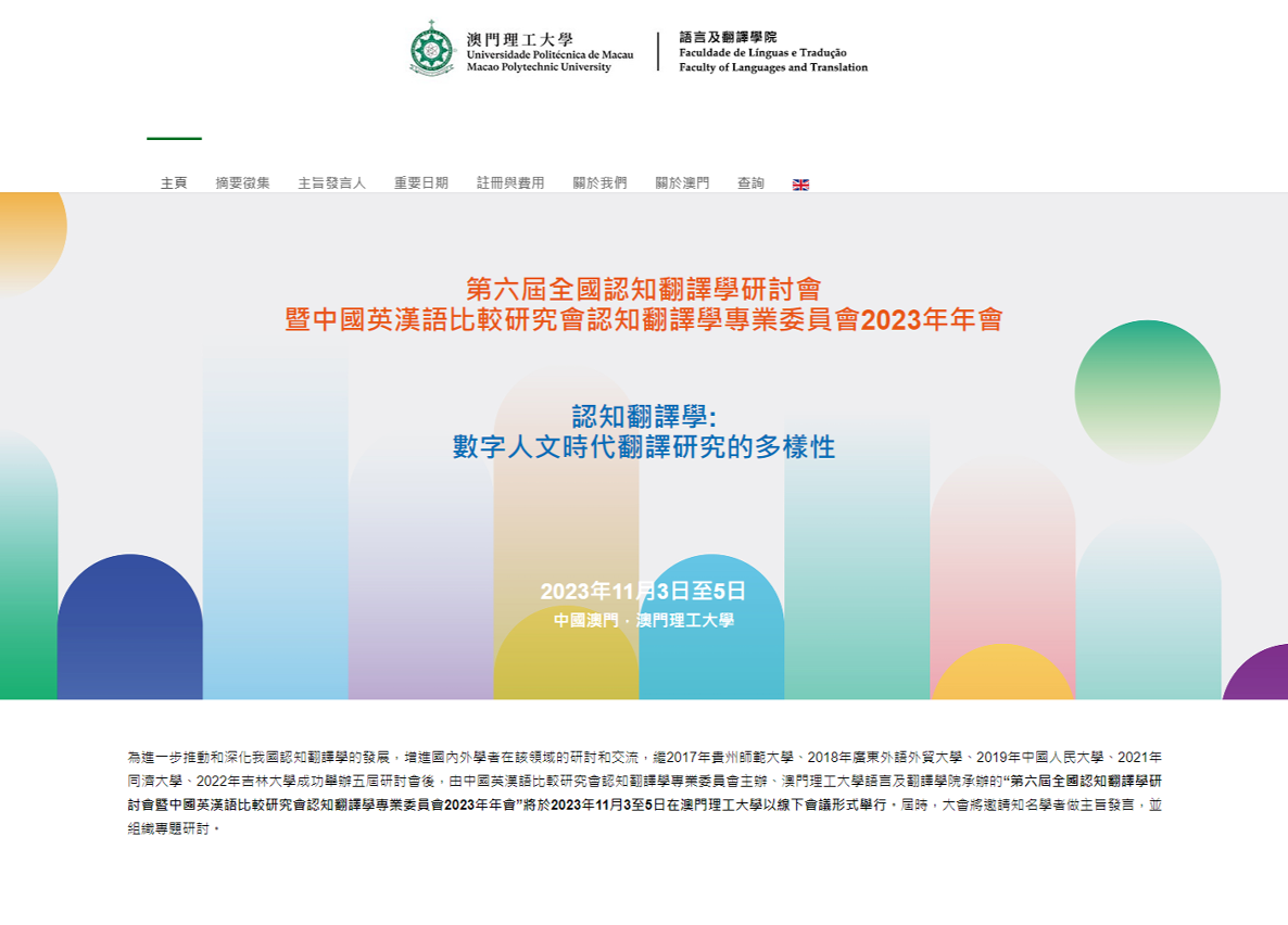由中国英汉语比较研究会认知翻译学专业委员会主办、澳门理工大学语言及翻译学院承办的“第六届全国认知翻译学研讨会暨中国英汉语比较研究会认知翻译学专业委员会2023年年会”将于2023年11月3至5日在澳门理工大学举行。这是全国认知翻译学研讨会首次于澳门地区举办,大会以“认知翻译学:数字人文时代翻译研究的多样性”为主题,鼓励数字时代的跨领域、多元化翻译研究。