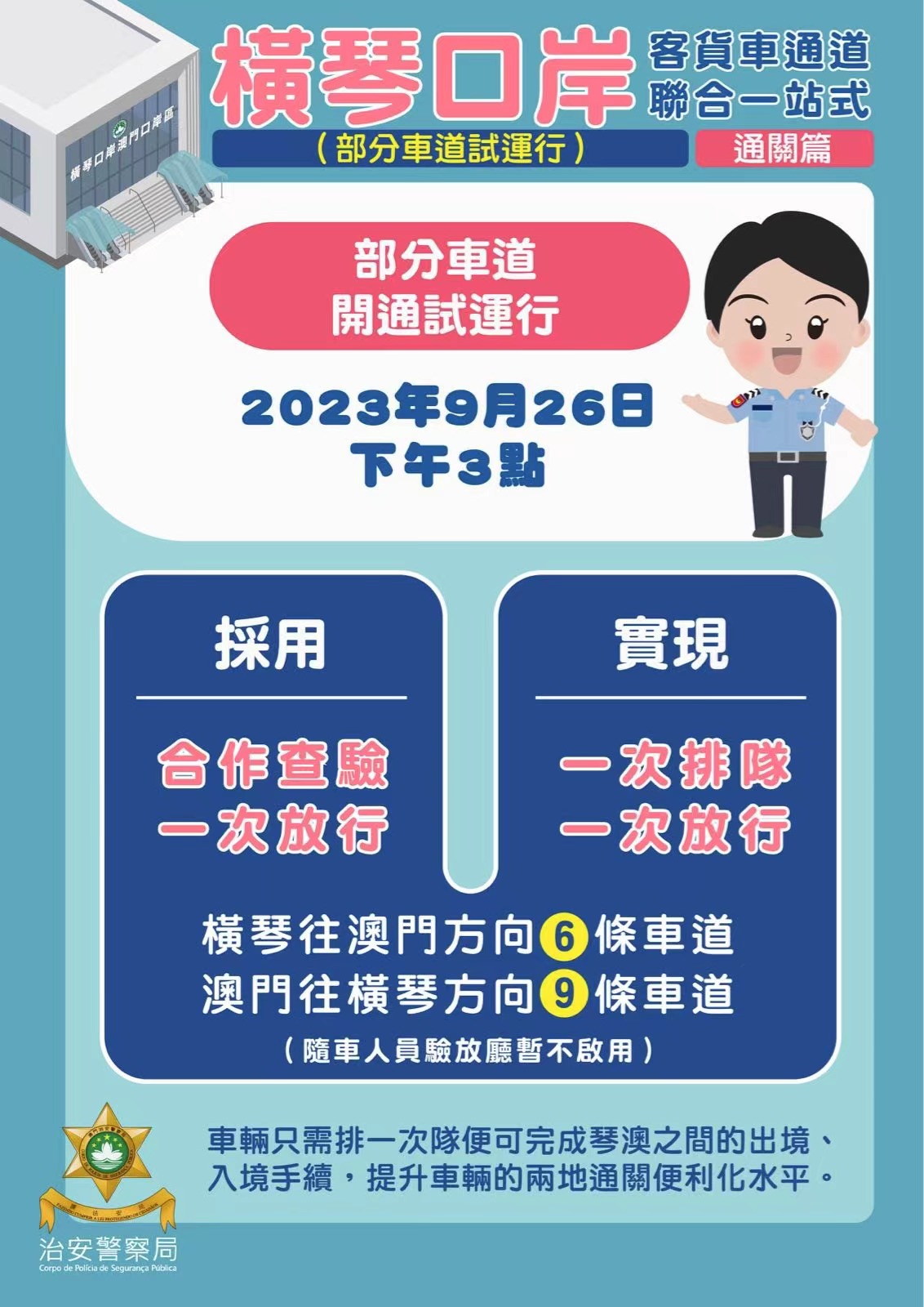 根据横琴口岸二期工程建设整体安排,客货车联合一站式部分车道(横琴往澳门方向6条车道,澳门往横琴方向 9条车道)已完成建设,经琴澳两地相关部门协商一致,定于2023年9月26日15时开通试运行。同时,澳门大学连接横琴口岸通道桥车道同步开通启用,莲花大桥全线恢复通车。