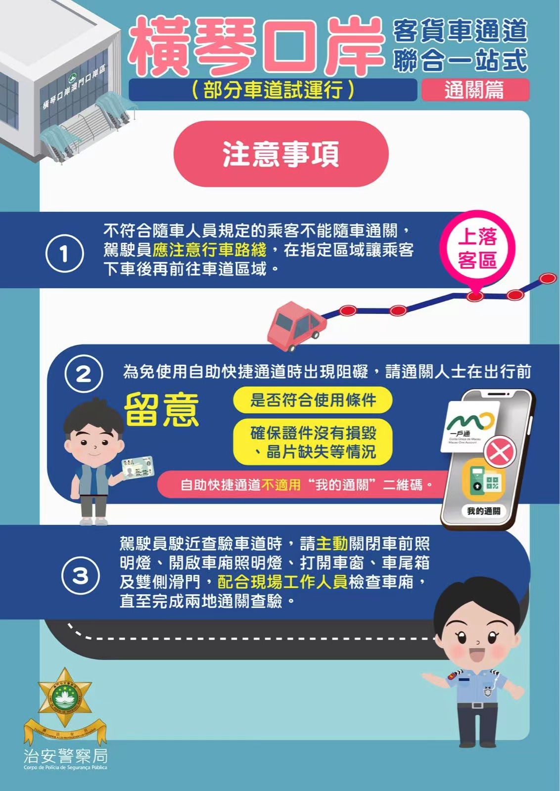 横琴口岸联合一站式部分车道开通试运行后,行车路线、查验模式均有所改变,请驾驶员和随车乘客注意以下事项。