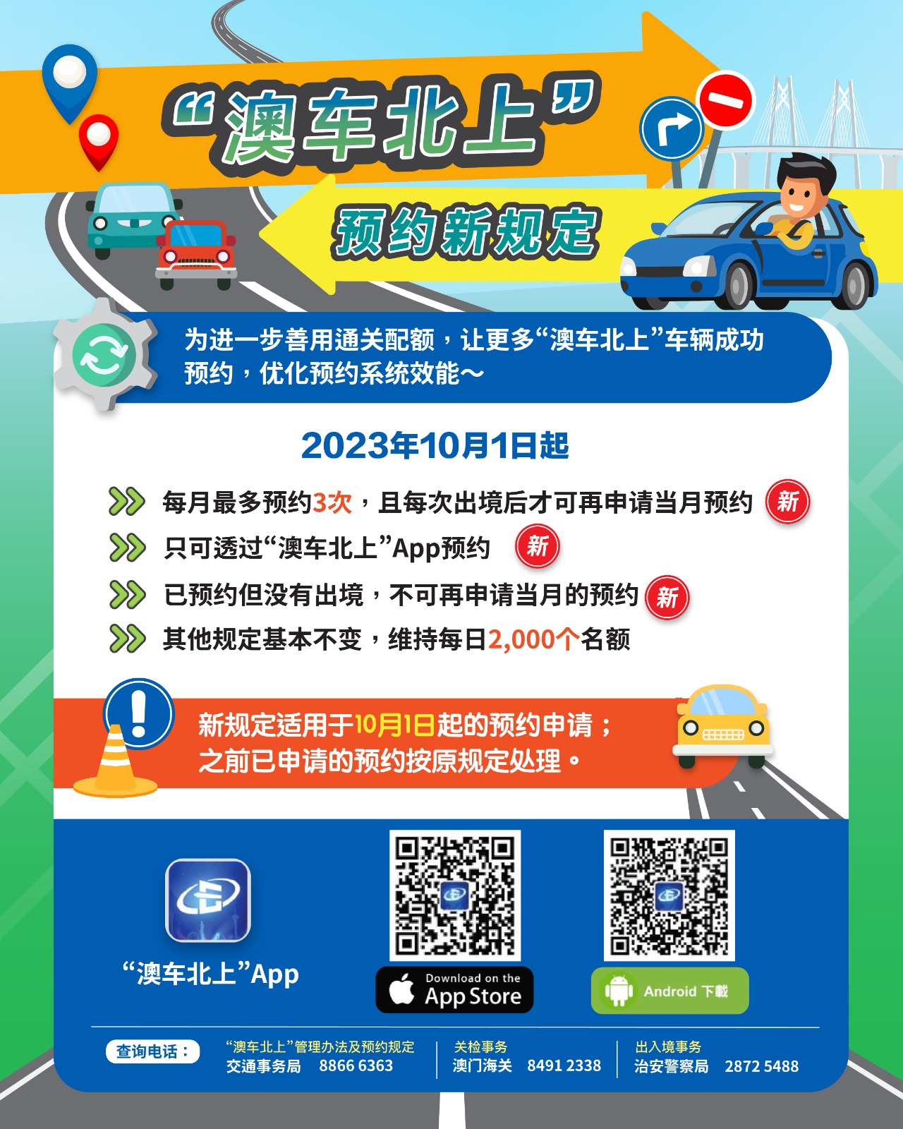10月1日起,“澳车北上”在原有“预约规则及注意事项”上,试行预约通关新安排,新安排增加了预约通关次数限制及调整失约后果 (详见附表)。另外,为优化系统效能,必须经“澳车北上”App进行预约。两地相关单位将继续密切留意预约情况,适时优化调整。各项具体预约规则及注意事项,请浏览“澳车北上”专页(https://www.dsat.gov.mo/mcars-to-gd/index.aspx?a_id=2000021)。市民如有疑问,可致电相关部门查询,交通事务局(澳车北上管理办法及预约规定)电话:88666363、澳门海关(关检事务)电话:84912338或治安警察局(出入境事务)电话:28725488。