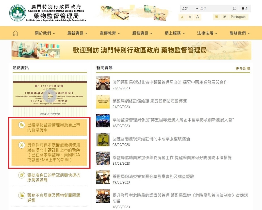 为促进新药的临床应用,药监局持续加强新药的资讯发布,包括在药监局网页公布“已获药物监督管理局批准上市的新药清单”及“具条件可供本澳的医疗机构使用及在澳门申请注册的新药清单”,方便本澳药业界、医疗机构及医疗专业人员查阅新药资讯。自药监局成立以来,已依法审批45项新药在澳门登记上市,当中有17款药物属于同类首创(first-in-class)。药监局会持续优化药物审评审批制度,以保障公众用药可及性,也助力澳门医疗旅游发展。
