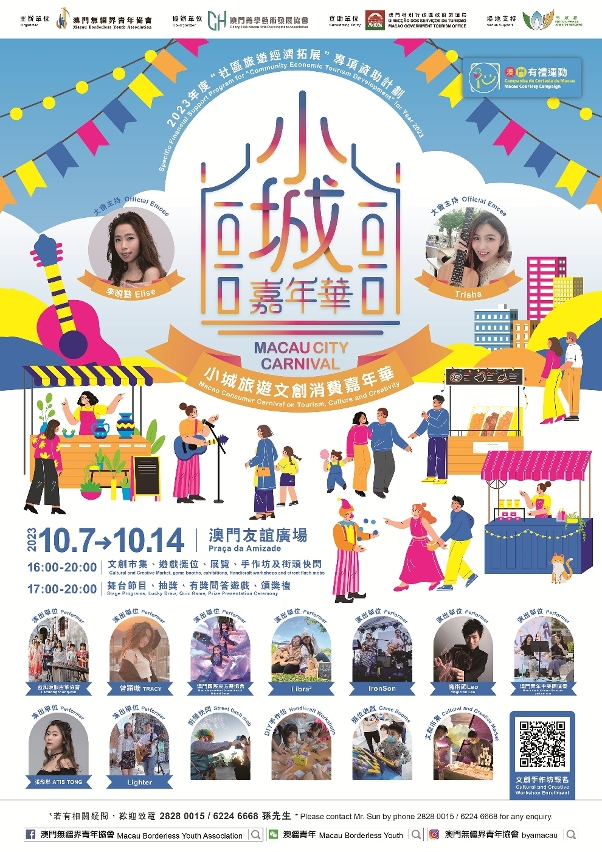 “小城旅游文创消费嘉年华” 将于10月7日至14日下午4时至晚上8时,一连八天在友谊广场举行。约20个澳门原创品牌及特色小店汇聚于市集,配以摊位游戏、文创体验工作坊、主题互动布置、舞台表演及消费指南设计作品主题展览,丰富的活动体验促进“旅游+文创”跨界融合。活动亦将推出“齐来小城消费微信小游戏",参加者有机会赢取商户电子现金券或实体礼品。