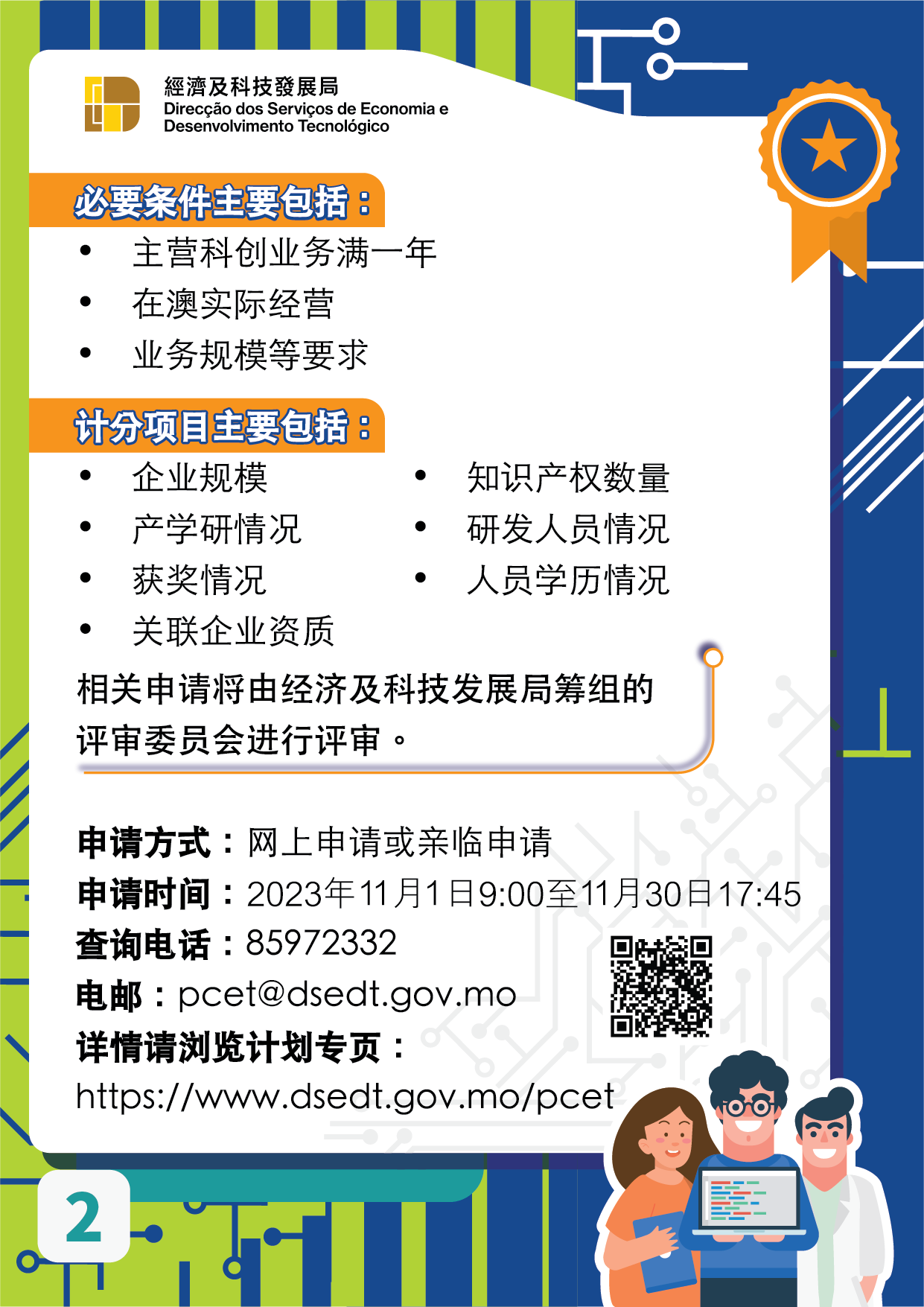 本年度第二轮申请期为11月1 日至30日,申请者可透过经科局网上系统提交申请。有关获认证企业名单以及计划申请详情,可浏览计划专页(https://www.dsedt.gov.mo/pcet),或致电8597 2332查询。
