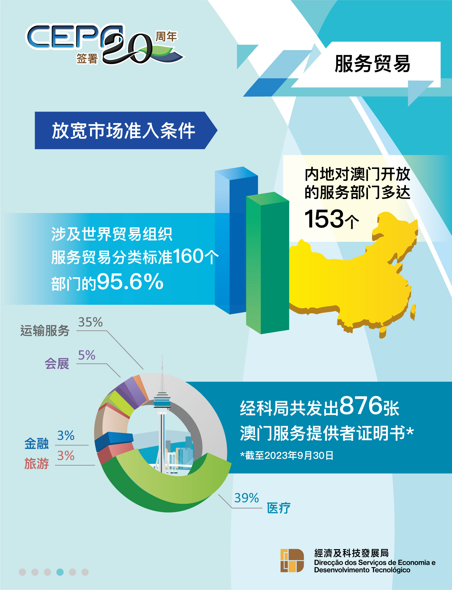 服务贸易方面,经科局至今共发出了876张“澳门服务提供者证明书”,协助澳门企业到内地开展商机。通过CEPA的开放政策,尤其在粤港澳大湾区城市先行先试的优惠措施,多个澳门专业服务,如金融、医疗、法律、税收、建筑工程、旅游及社会服务等多个领域的企业及专业人士把握内地进一步对澳门服务业开放的契机,成功到内地拓展业务。