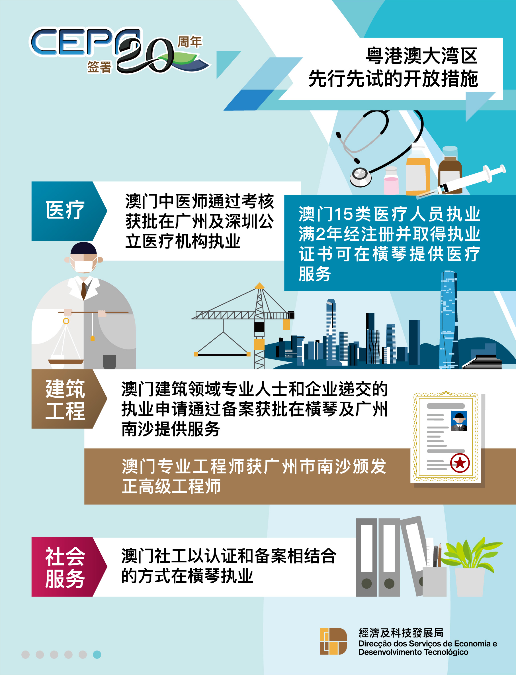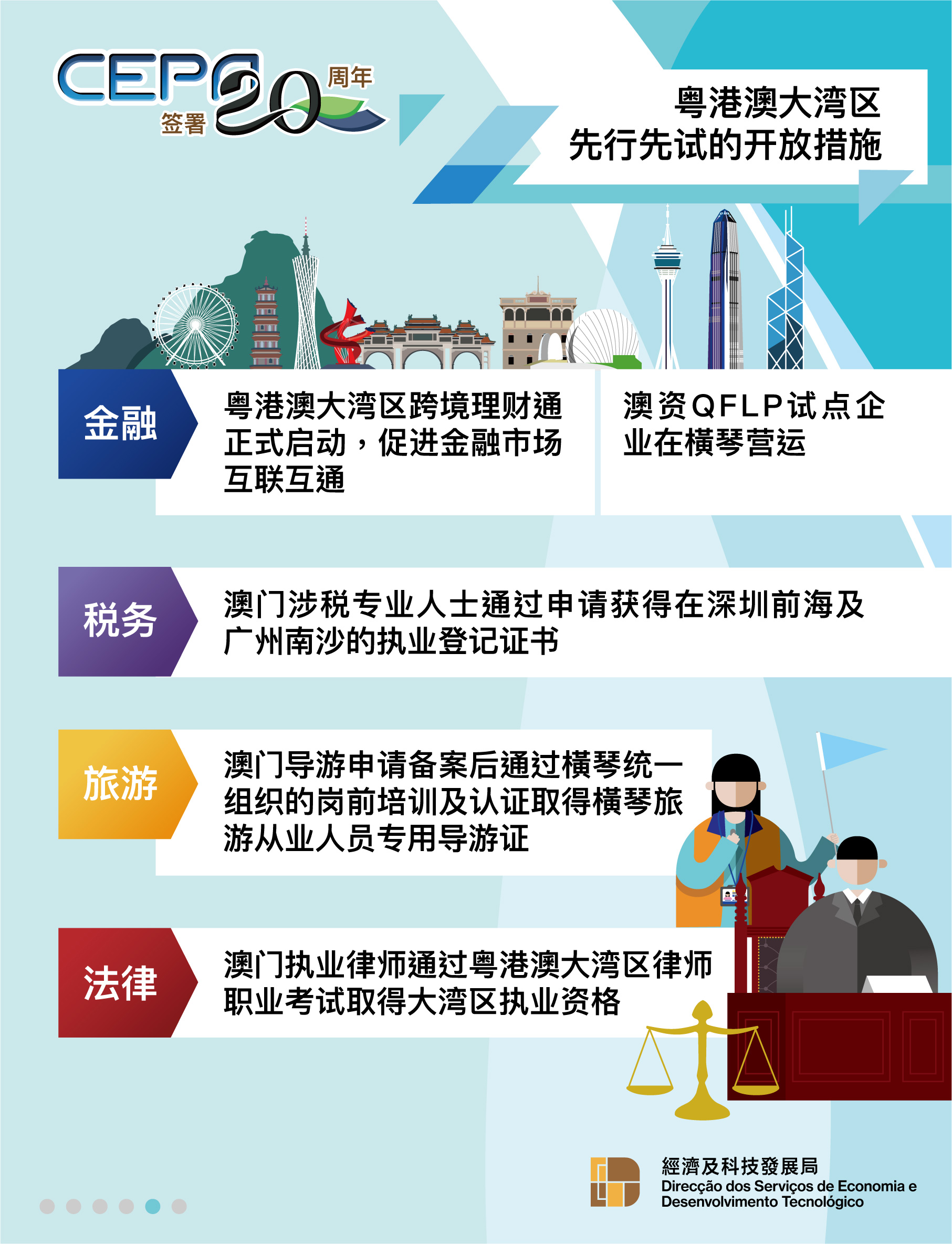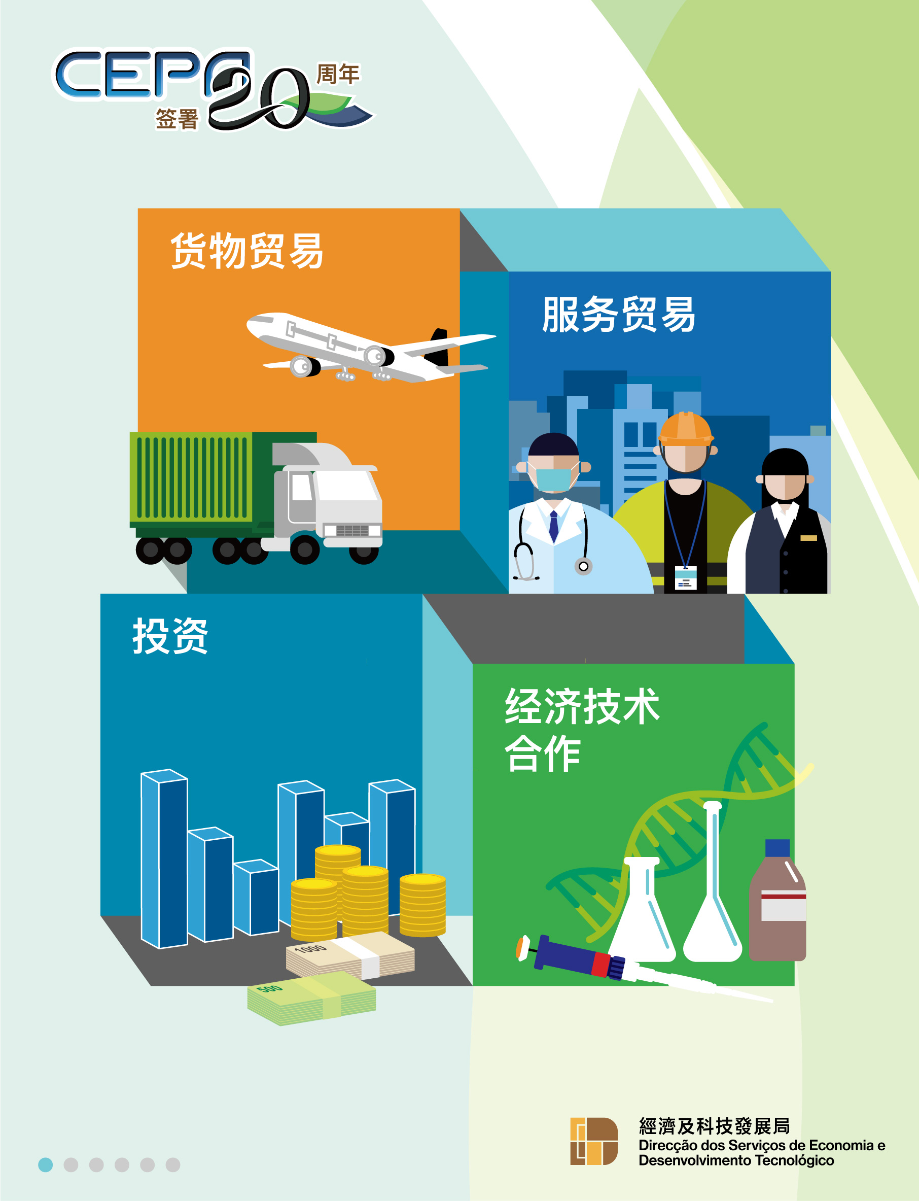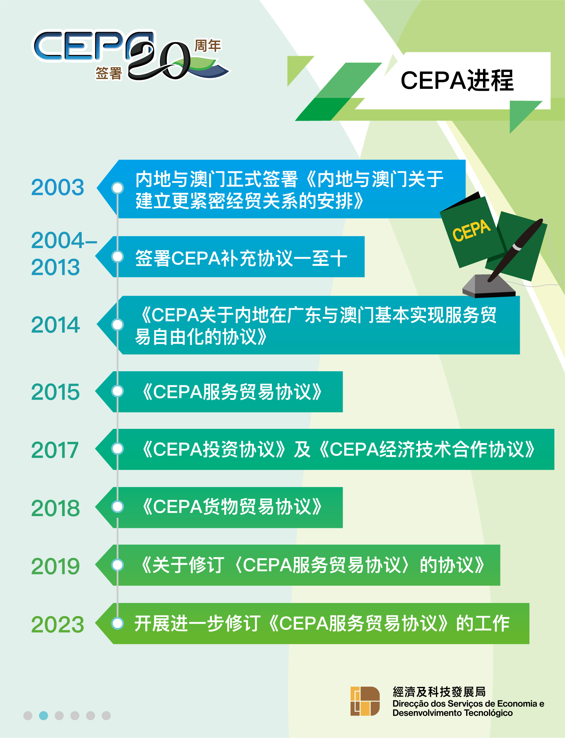 为庆祝CEPA签署20周年这个重要的里程碑,经济及科技发展局展开一系列的宣传,包括举办“CEPA签署20周年” 图片展、制作主题宣传短片以及简易图文包等,与社会各界共同回顾CEPA二十年来的发展和成果,展望CEPA未来为业界带来更多发展机遇,促进澳门经济多元发展。