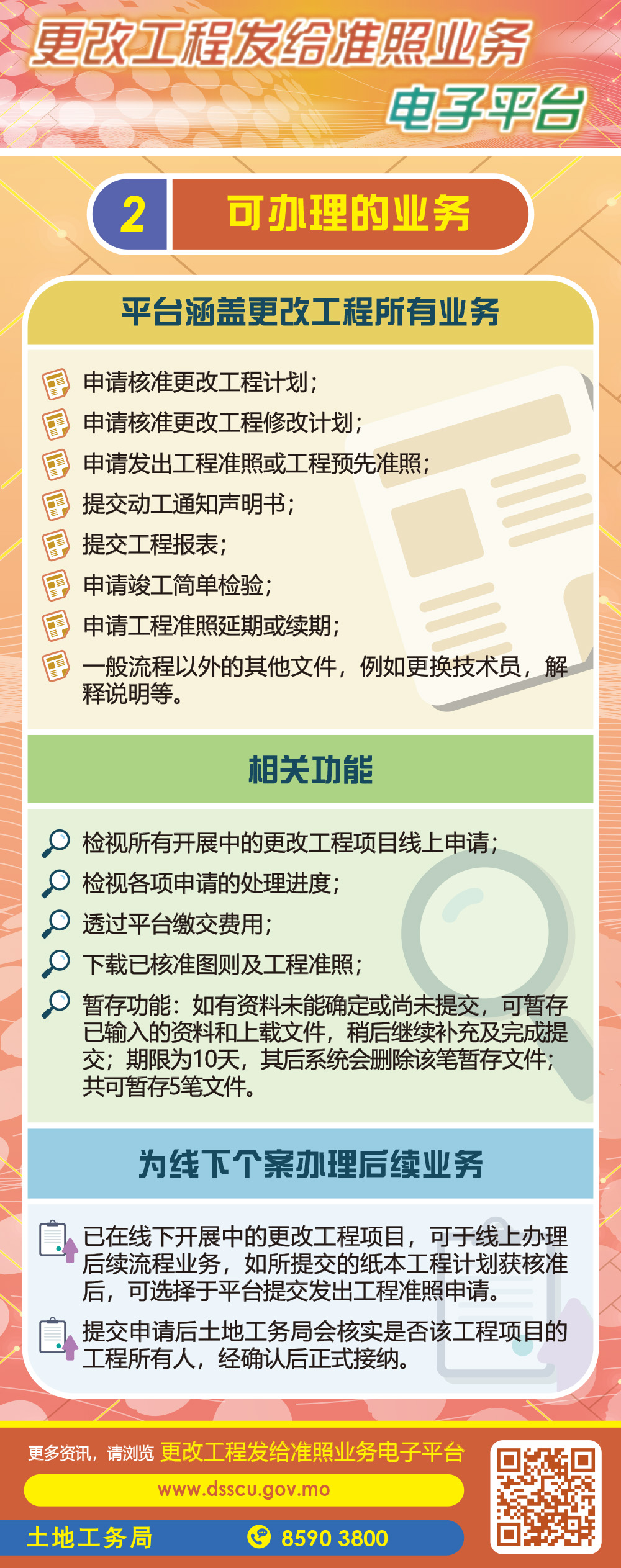 为配合特区政府落实电子政务工作,土地工务局推出的 “更改工程发给准照业务电子平台”( 下简称“平台”)将于10月25日上线。平台涵盖更改工程所有业务,使用者透过个人一户通或实体帐户登入后,可不受办公时间制约,随时于网上办理相关业务,以及可检视各项申请的处理进度和部门回覆等内容,相信可进一步便利市民和业界。