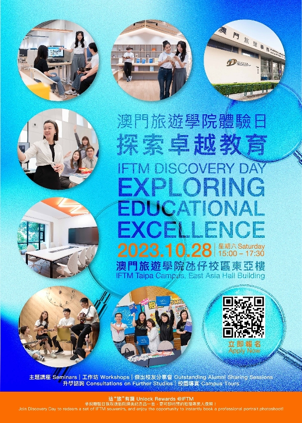 “澳门旅游学院体验日:探索卓越教育"将于10月28日(星期六)举行,透过不同的精彩活动,让澳门及邻近地区学生、家长和朋友了解澳旅院最新的入学资讯及教学特色,体验大学生活及校园文化。欢迎有兴趣人士报名参与。