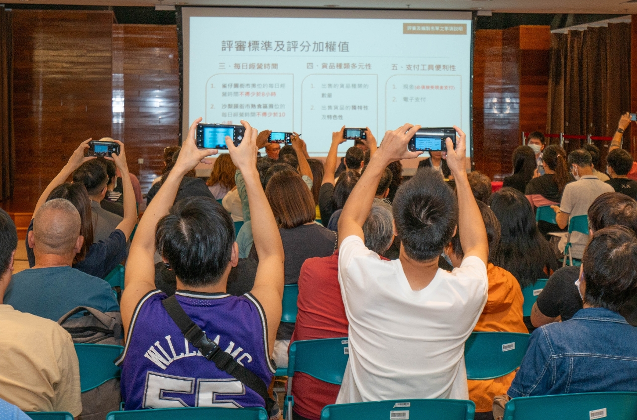 为了让有意投标者更好地瞭解竞投程序、正确填写公开竞投申请表、撰写竞投计划书应注意事项,市政署于十月二十五日在沙梨头活动中心举行了三场公开竞投讲解会,吸引逾四百六十名市民参加,反应热烈。会上,与会者主要关注亲身及持续经营、摊贩休假安排及续约等涉及日常营运事宜,市政署代表逐一回应了与会者的提问,并强调希望引入更多新经营者,活化传统街市。及后,市政署亦安排有意投标者于翌日分批到雀仔园街市及沙梨头美食广场,实地瞭解摊位间隔及场地整体布局,以便提出更优秀的营运计划,竞投心宜摊位,共有逾二百名市民参与。