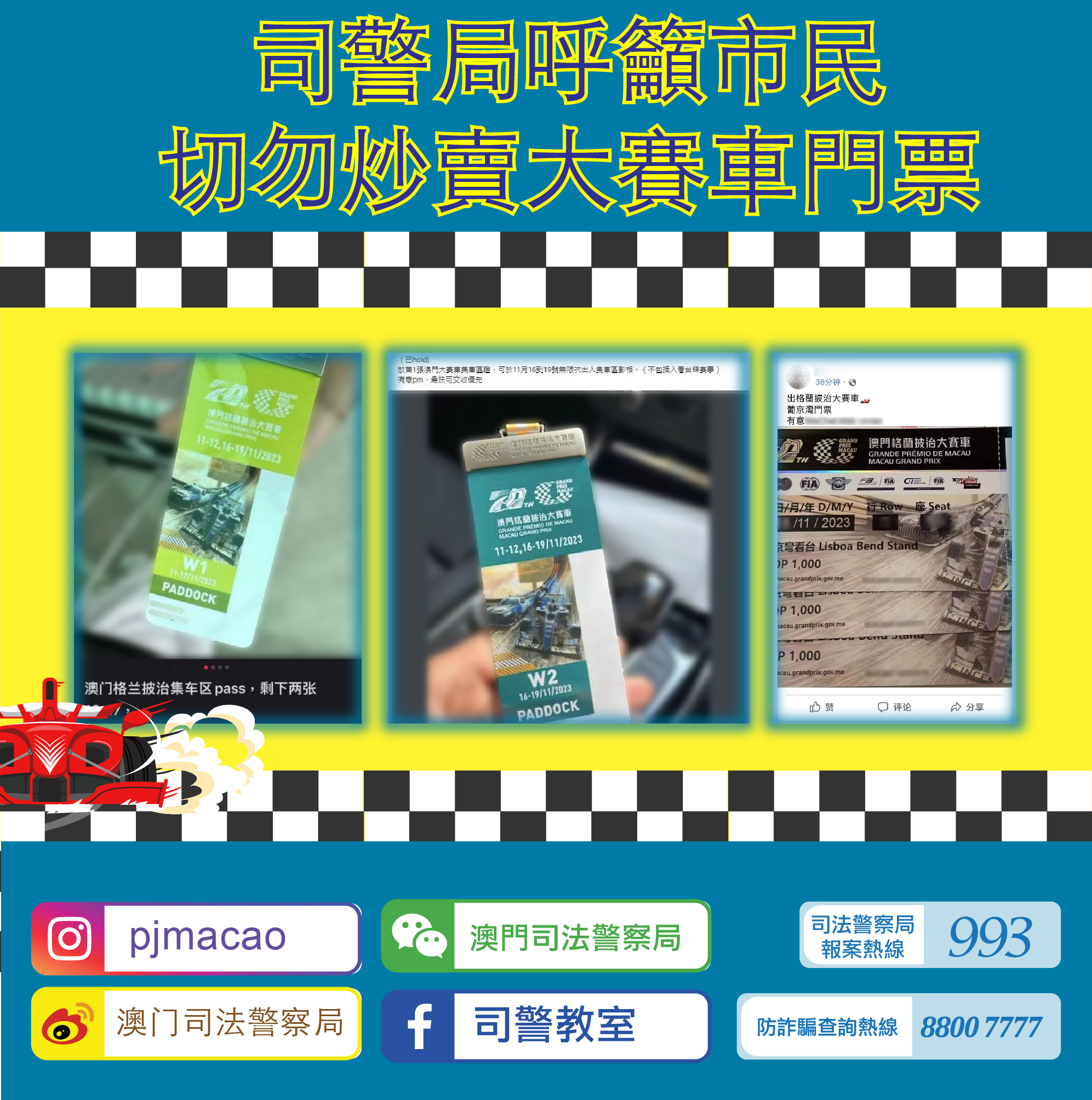 近日,司法警察局发现有人于网上社交平台炒卖第70届澳门格兰披治大赛车定价门票、大会赠券以及特许通行证。