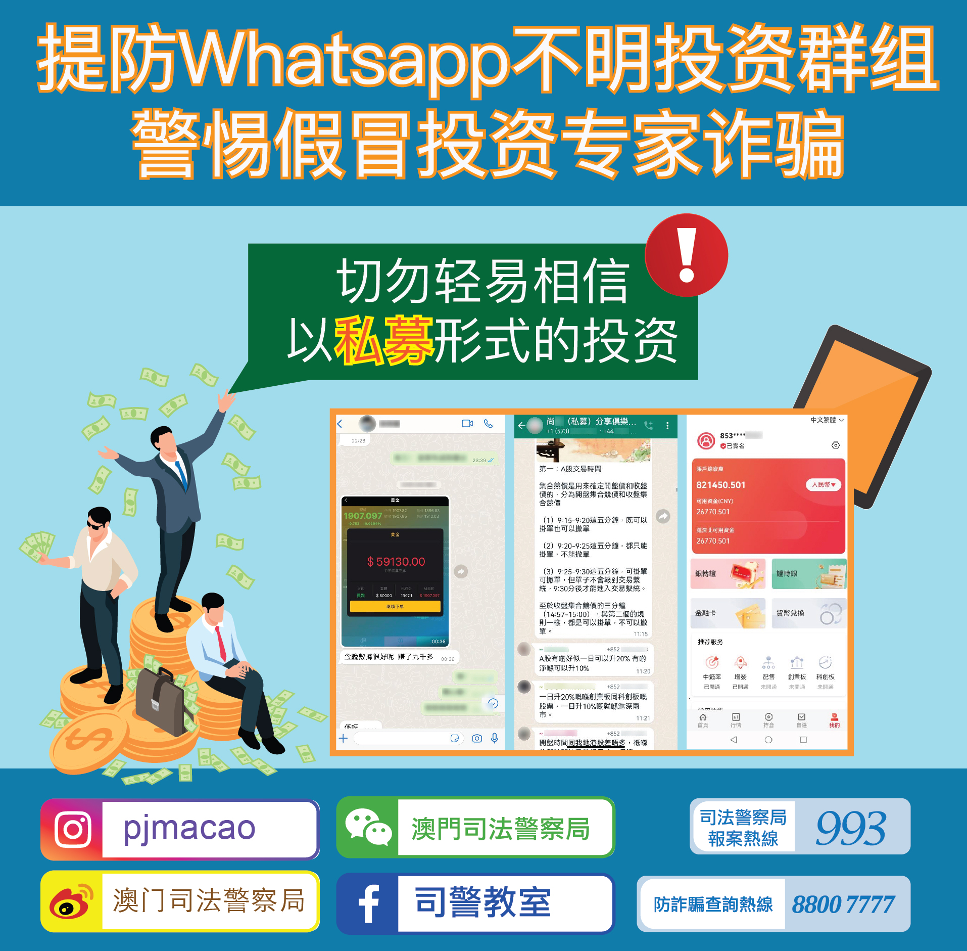 司警局近日接获两名市民举报,指较早前在Whatsapp通讯软件中无故被拉入一个名为「尚X私募分享俱乐部」的投资群组,二人在群组中跟随自称投资专家的教学进行“投资”,最终发现被骗,二人损失合共超过一百万澳门元。