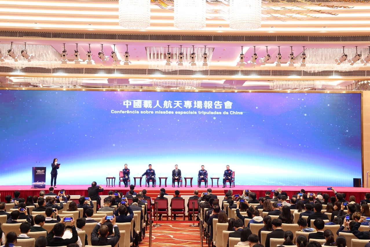 中国载人航天工程代表团于报告会上与逾四百名澳门教育界代表、科技界代表、中学生和大学生,分享国家载人航天科技事业的发展成就及航天经历。会上,神舟十四号航天员指令长陈冬分享航天经历,以及由空间站系统总设计师杨宏、空间应用系统副总设计师钟红恩和酒泉发射场系统副总指挥王学武分别报告。最后,中国载人航天工程代表团团长、中国载人航天工程办公室副主任林西强和四名航天员与澳门学生展开互动交流环节,由团员逐一回应学生提出有关国家航天及科技发展的提问。