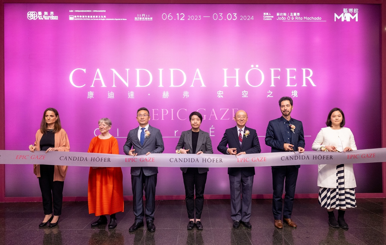 文化局辖下澳门艺术博物馆主办的“康迪达‧赫弗:宏空之境”今日(12月5日)在澳门艺术博物馆一楼举行开幕仪式,澳门特别行政区政府文化局局长梁惠敏、中央人民政府驻澳门特别行政区联络办公室宣传文化部副部长田小平、澳门日报社长陆波、摄影艺术家康迪达‧赫弗、展览策展人苏约翰、孟丽泰及澳门艺术博物馆馆长袁绍珊等出席主礼。