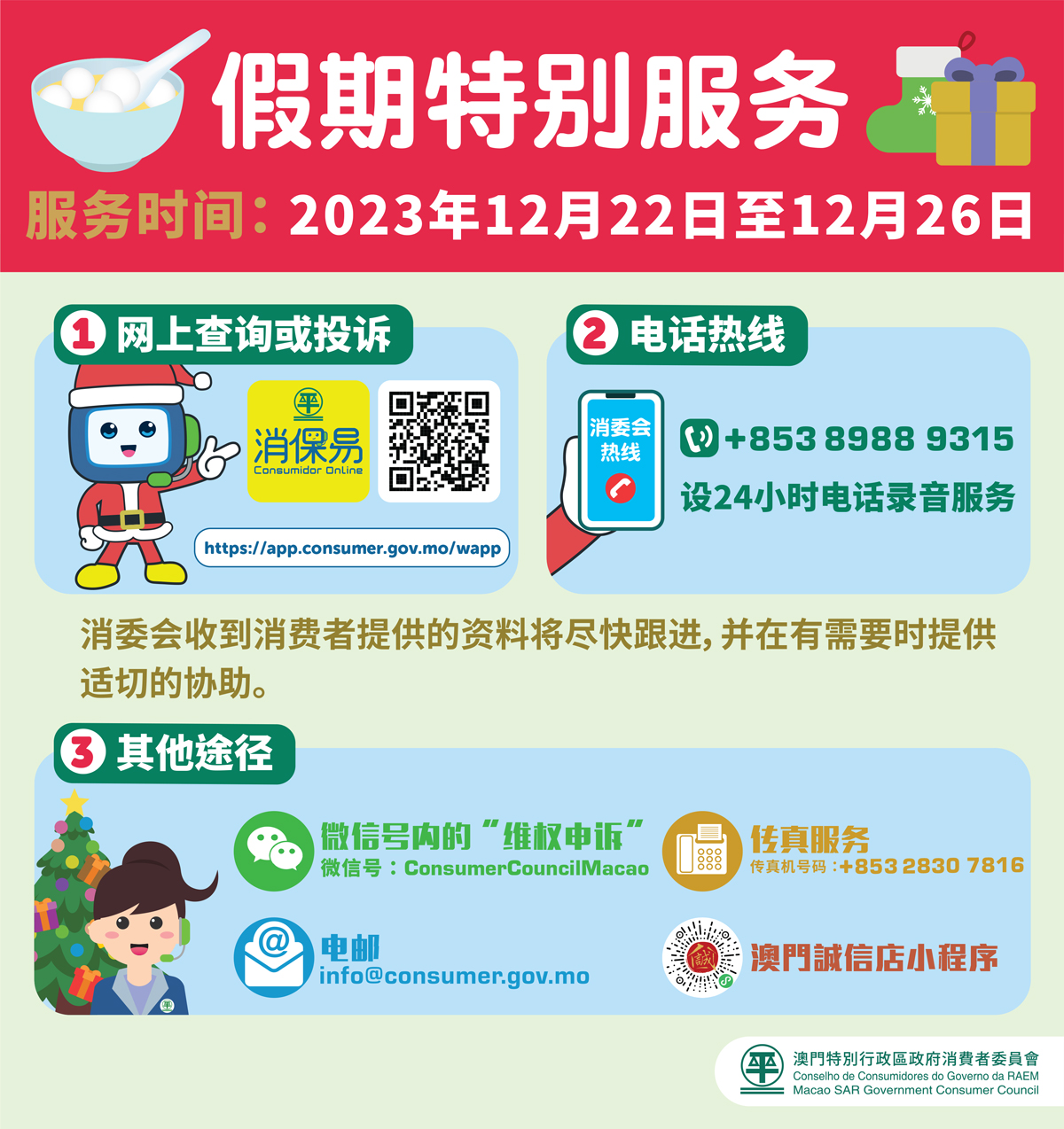 消费者委员会配合冬至及圣诞节假期,由12月22日至26日安排一连五天假期特别服务,为消费者提供查询或投诉服务。