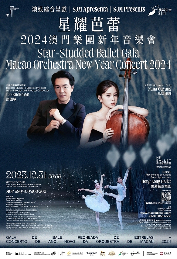 由文化局、澳门乐团有限公司、澳娱综合度假股份有限公司呈献的《星耀芭蕾——2024澳门乐团新年音乐会》,将于2023年12月31日(周日)晚上8时在澳门文化中心综合剧院隆重举行,由澳门乐团音乐总监兼首席指挥廖国敏,联同大提琴家及歌手欧阳娜娜,携手演绎多篇经典乐章,同场更特别邀请香港芭蕾舞团演出,以优雅的音韵与舞姿为观众带来视听双重享受,共迎新年。音乐会由澳娱综合度假股份有限公司冠名呈献,节目自开售以来广受观众欢迎,火速售罄,主办单位应观众热烈回响将加开座位,门票即日起于澳门售票网各售票点、网上及电话同步发售。