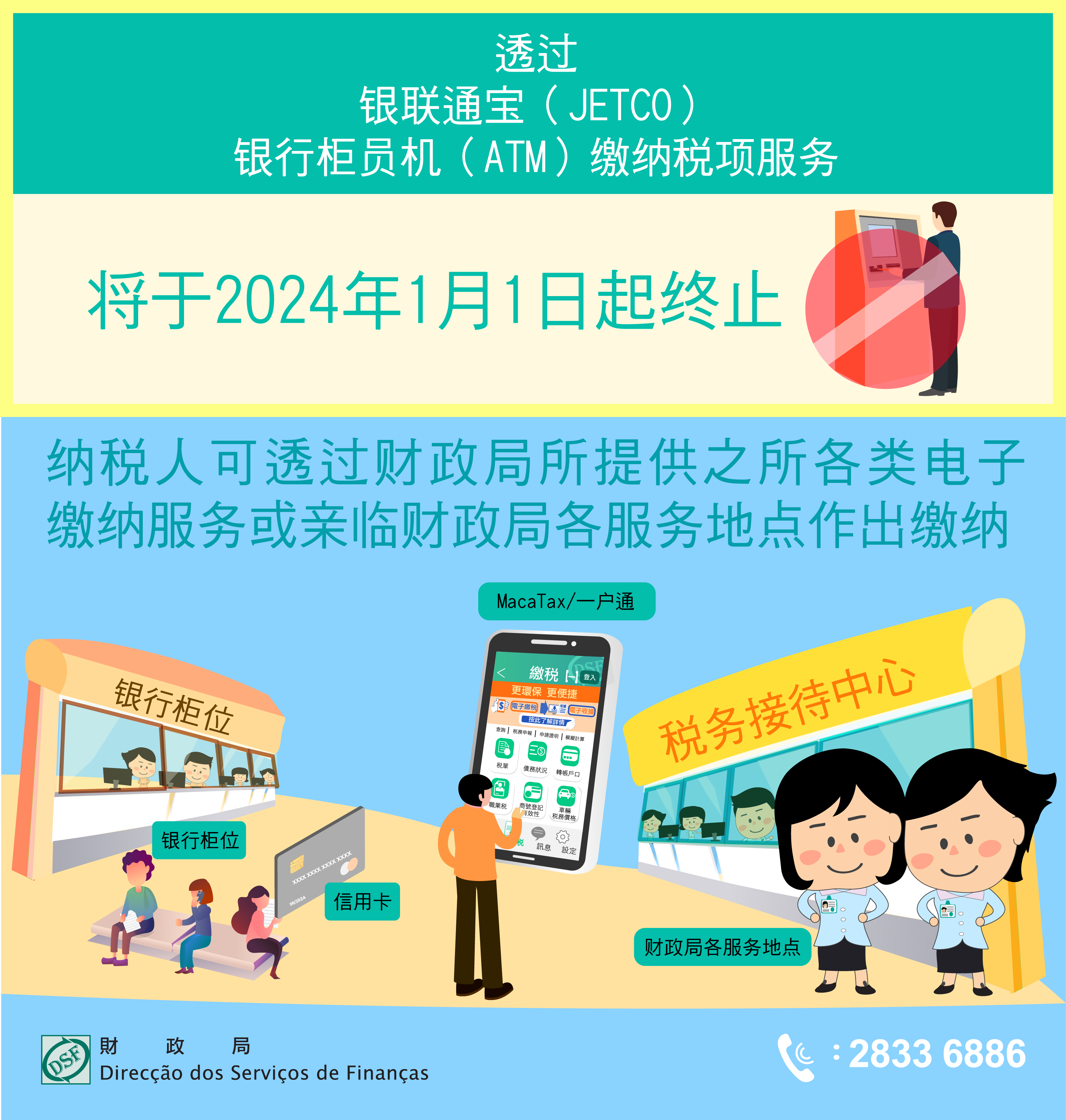 财政局近年积极推动电子政务,为有效分配行政资源,经检视和整合各种纳税方式之后,2024年1月1日起终止透过银联通宝(JETCO)银行柜员机(ATM)缴纳税项的服务。