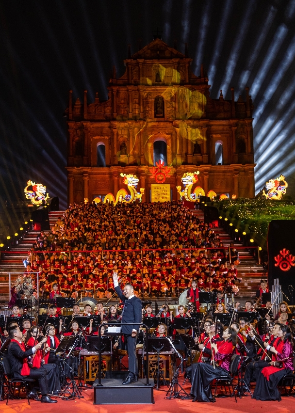 同场举行了“欢乐春节 春满濠江”音乐会,邀请到我国顶尖音乐家,包括斐声国际的作曲及指挥家谭盾、国家一级指挥彭家鹏及钢琴大师郎朗,携手澳门乐团第一小提琴首席后则周、澳门中乐团琵琶声部首席邓乐、敲击乐首席李畅,澳门中乐团、澳门少年合唱团、澳门罗梁体育总会等本澳艺文单位,在大三巴牌坊下呈献节日气氛浓厚的音乐作品,为全球民众送上新春祝福。节目将于新春期间在文化和旅游部的官方平台及合作渠道中播放,欢迎届时收看。