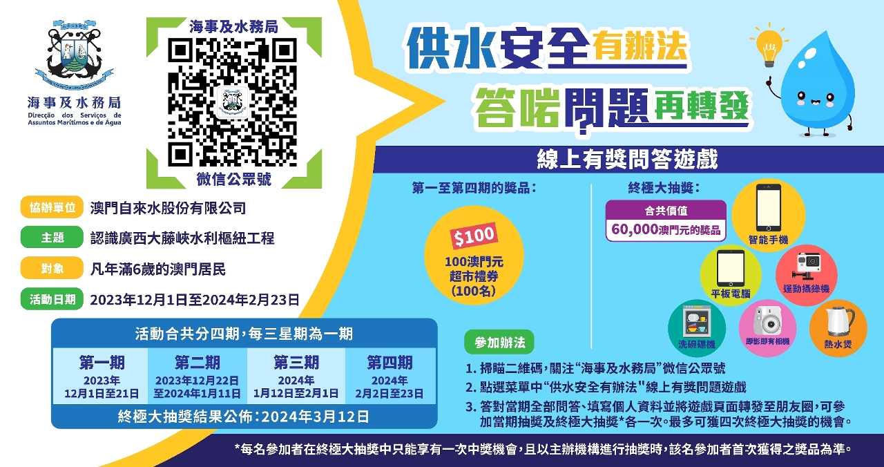 “供水安全有办法"线上有奬问答游戏,以轻松的活动方式培养市民饮水思源、感恩国家之心,增强节约用水的意识。活动的首三期已结束,吸引近4,200名市民参与,得奖者的名单已上载至本局网页及微信号,海事及水务局会以电话短讯通知得奬者,得奖者需凭指定资料于限期内到海事及水务局大楼综合服务中心领奖,第二期及第三期之领奖期分别至2024年2月23日及3月8日为止。