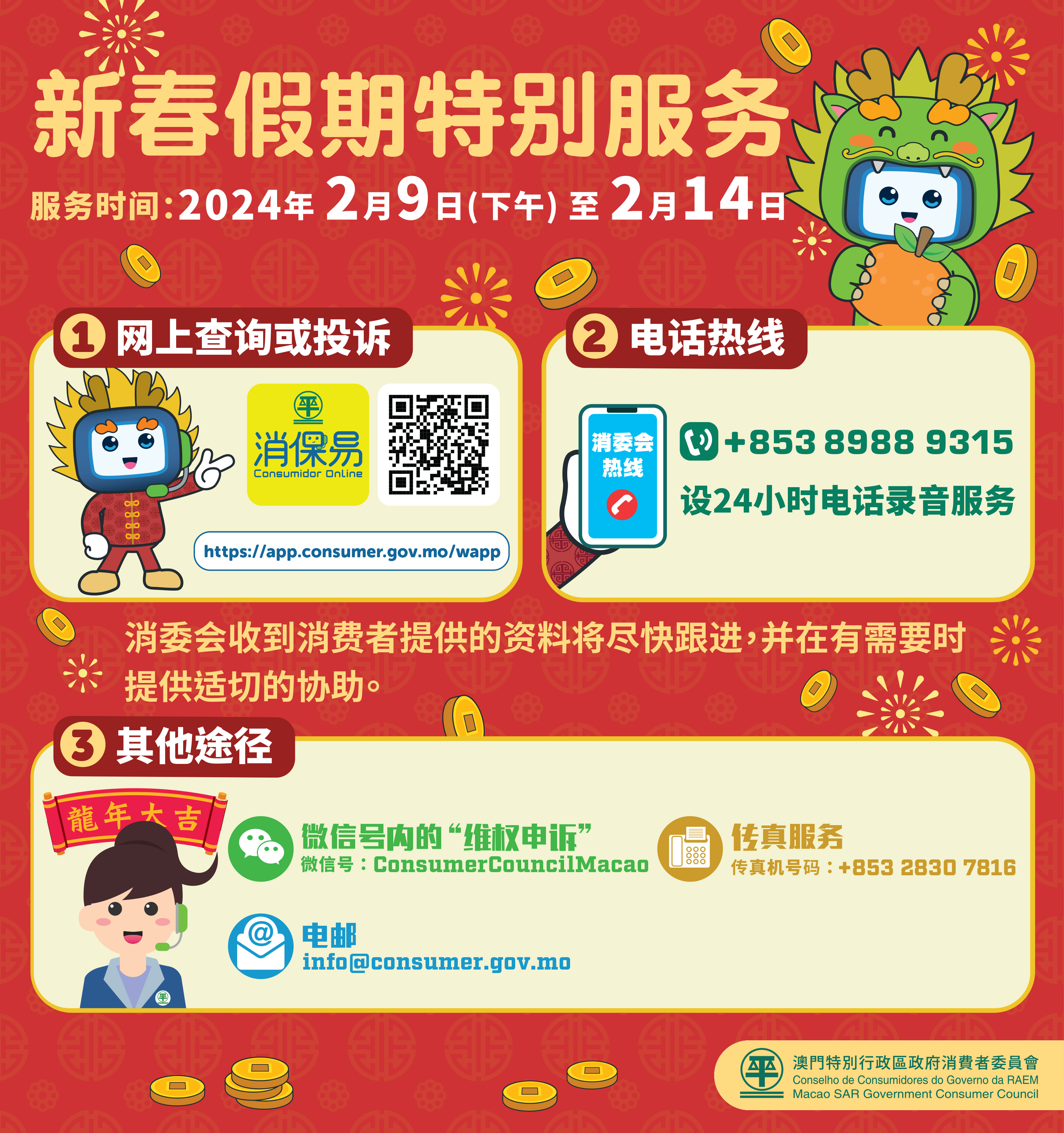 消费者委员会配合新春假期,由2月9日(下午)至14日设假期特别服务,为消费者提供查询或投诉服务。