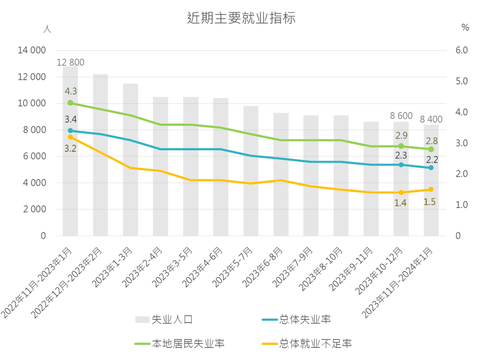 统计暨普查局资料显示,2023年11月至2024年1月总体失业率为2.2%,本地居民失业率为2.8%。两者均较上一期(2023年10月至12月)下跌0.1个百分点,亦已回复至2020年初的水平。总体就业不足率则微升0.1个百分点至1.5%。
