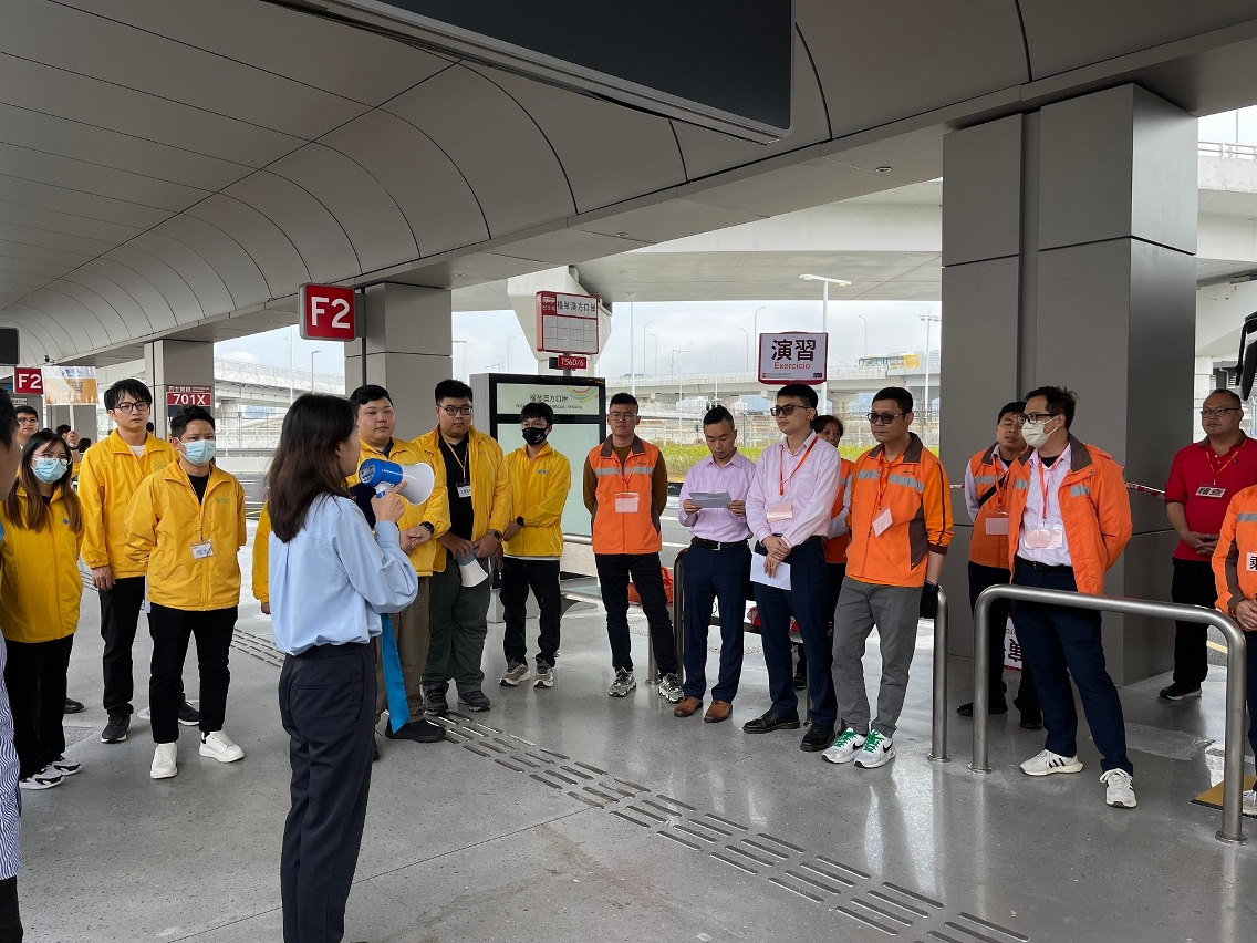 当中,演习模拟出现大量人士滞留在横琴口岸澳门口岸区,巴士公司接获治安警察局通知有关情况后,立即安排流动站长或稽查人员到横琴澳方口岸巴士站,与驻场站长一同维持候车秩序,同时加密班次和调度附近巴士车辆以疏度乘客。