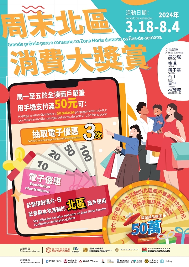特区政府联同澳门中华总商会及澳门北区工商联会共同合作,于3月18日至8月4日期间,举办“周末北区消费大奬赏”促进消费活动,将开展一系列宣传,包括活动专页、海报、图文包及宣传短片等。