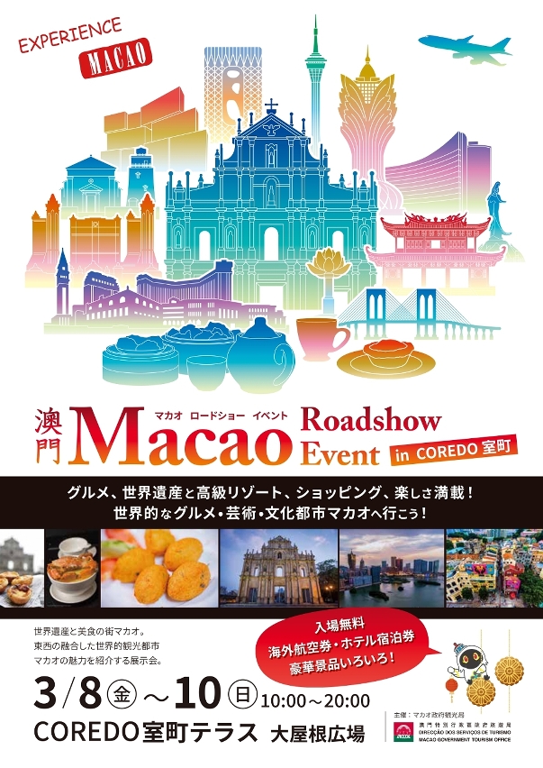 本次路展活动由3月8日起一连三天在东京COREDO室町Terrace大屋根广场举行。场地选于邻近东京站的高密度商业区,一公里范围约有50万人工作。活动是在去年全面通关以来,旅游局在日本举行的第一个路展活动,也是今年首个海外路展。澳门航空及澳门六家综合度假休闲企业亦在现场设置展位,推广旗下旅游设施及崭新元素,联动推出各类优惠旅游产品。