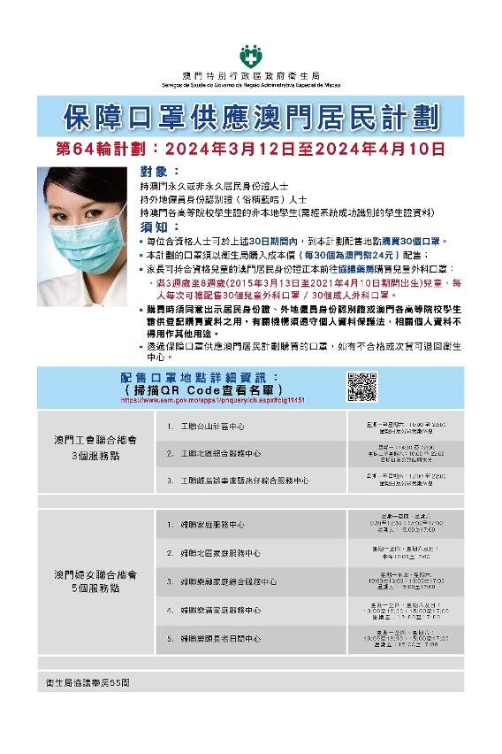 卫生局今(8)日公布,第64轮保障口罩供应澳门居民计划(下称“口罩计划”)于3月12日开始,具体如下: