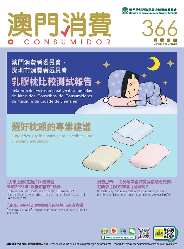 第366期《澳门消费》刊登澳门及深圳市消费者委员会联合公布的乳胶枕比较测试报告,以及介绍正确拣选枕头的专业建议。今期《澳门消费》报导2024年“最佳诚信店”参加情况。