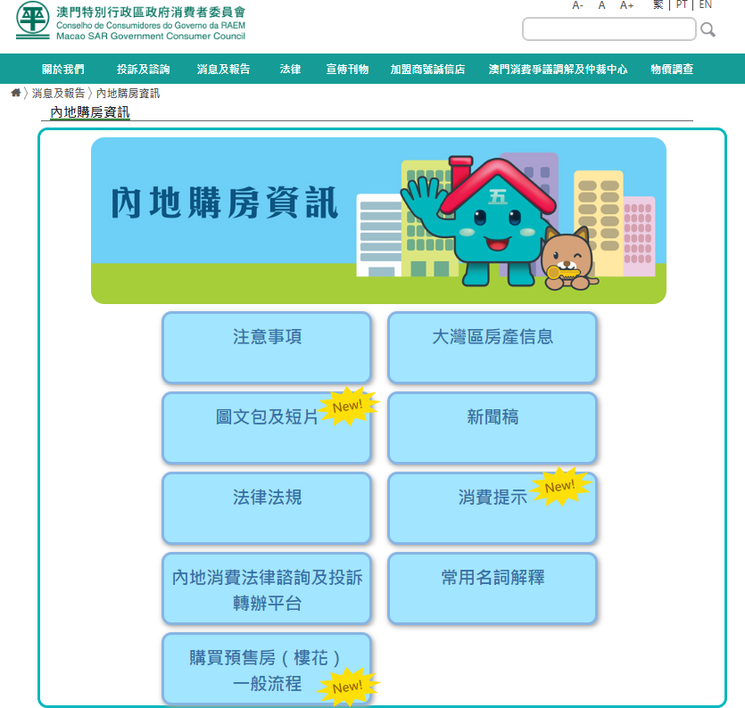 为加强居民对内地购房的维权意识,消委会持续丰富“内地购房资讯”专页资讯,提高内地房地产信息的透明度,目前该专页已增至9个专区,包括“大湾区房产信息”专区让居民可网上查核区内9个内地城市获批销售房产的相关资料、“五证”证号、分层单位的房屋用途、销售状态,以及监控户口帐号等资料,并设专区方便居民使用横琴粤澳深度合作区推出的“跨境消费通” 内地消费法律咨询服务,以及就内地购房等维权问题直接提出查询。