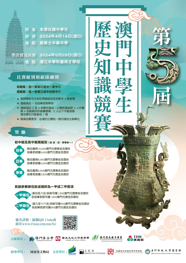 为提高澳门中学生对中国历史文化的兴趣和对本地历史的了解,以及向市民大众普及历史文化教育,澳门基金会及其历史文化工作委员会、澳门历史教育学会及澳门广播电视股份有限公司合办;河南省文物局指导;教育及青年发展局、文化局、澳门科技大学图书馆及河南省文物建筑保护研究院支持的第五届“澳门中学生历史知识竞赛”,由即日起至2024年3月29日接受报名,欢迎学校组队参加。