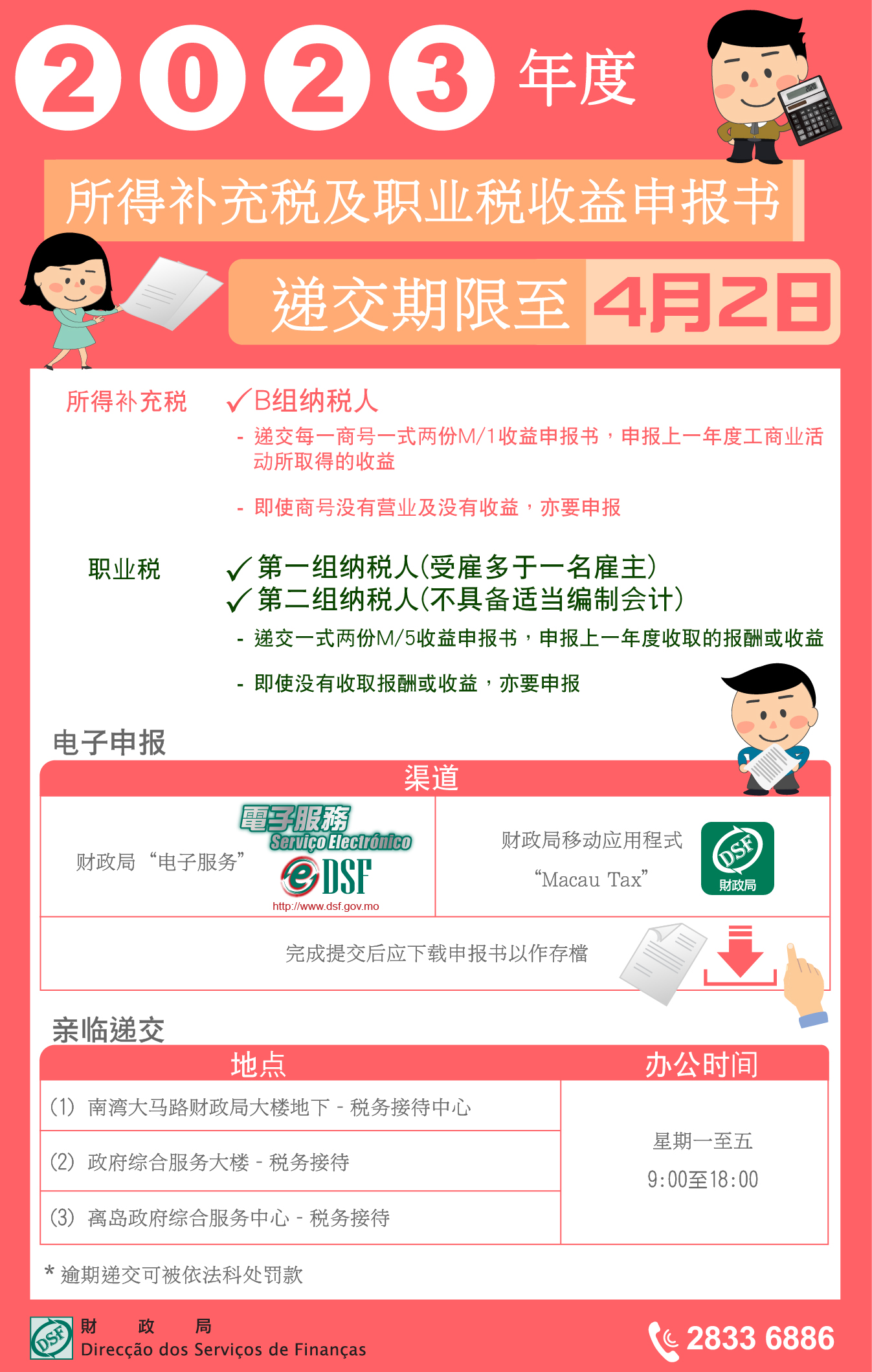另根据第14/2024号经济财政司司长批示,倘收益从多于一位雇主处取得的职业税第一组纳税人,又或不具备适当编制会计的职业税第二组纳税人,亦须于4月2日或之前递交一式两份的2023年度职业税M/5式收益申报书。