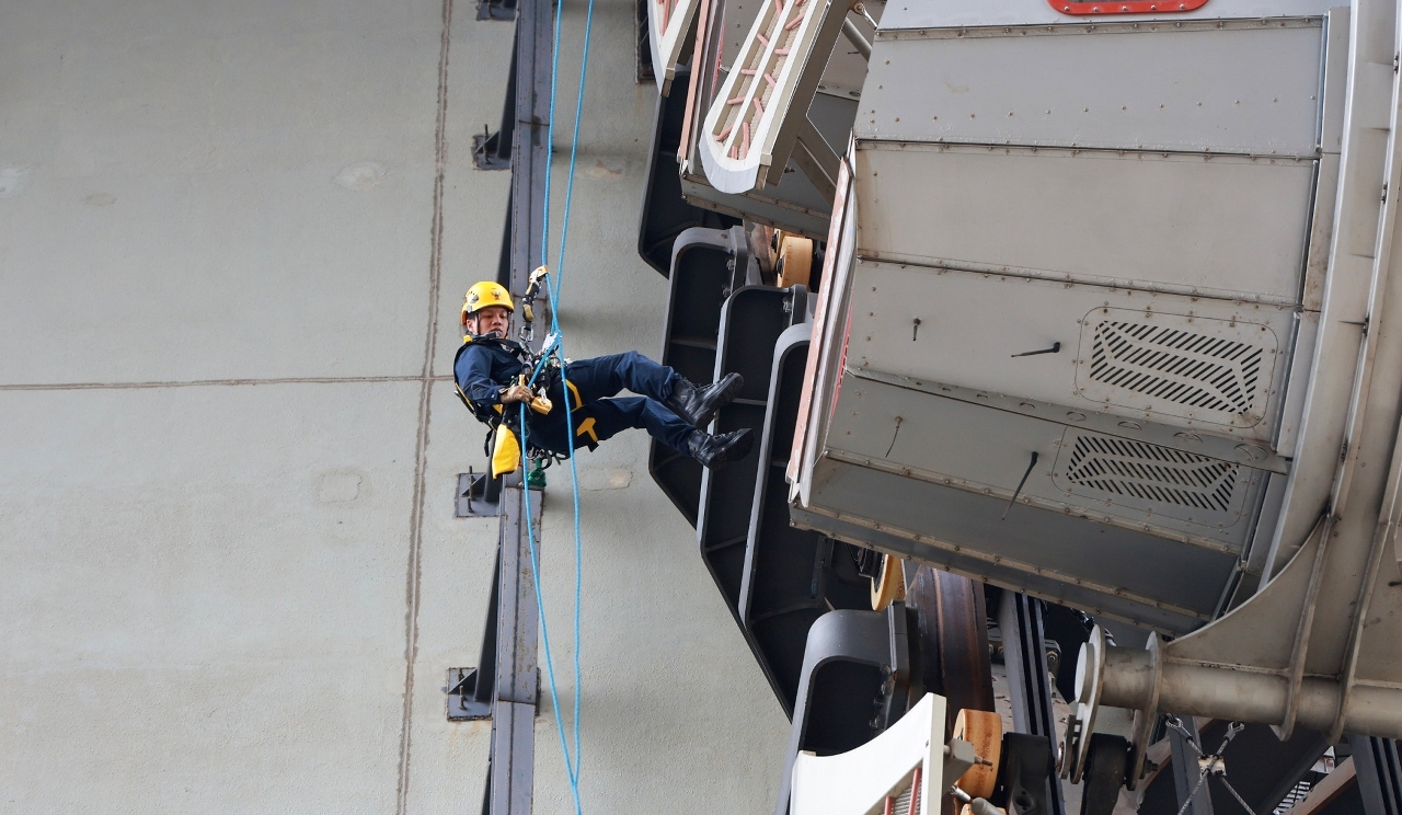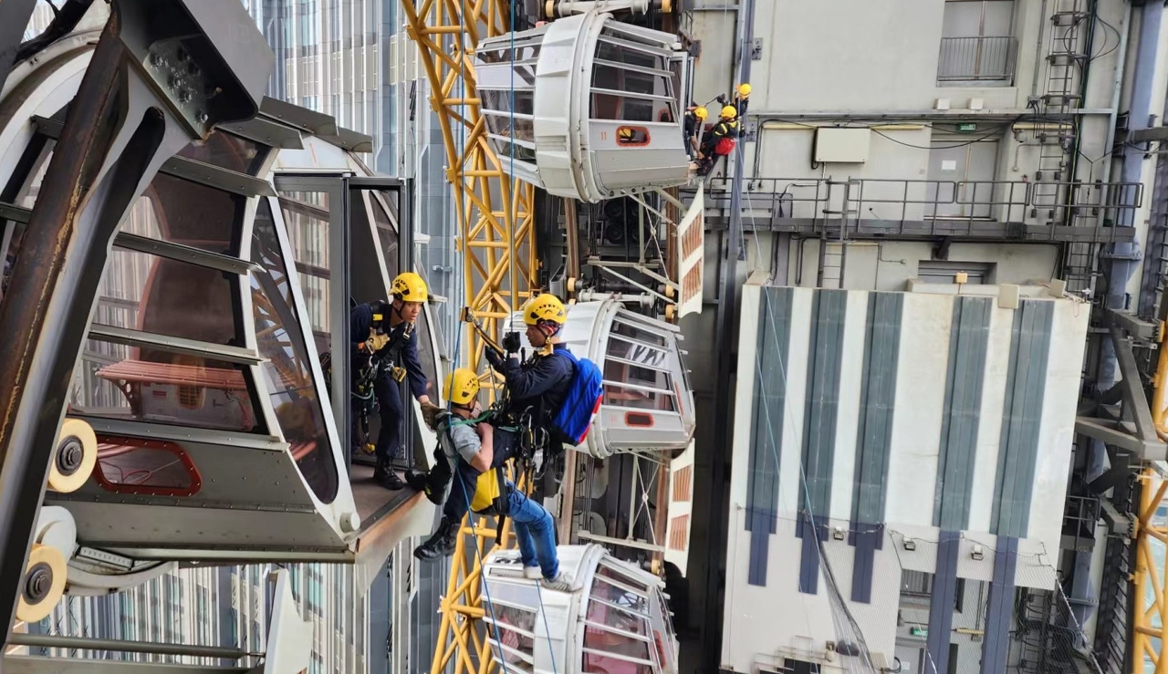 消防局接报后,立即派遣5架紧急车辆及17名队员赶赴现场,消防局高空拯救队员联同新濠影汇绳索救援人员,按既定计划开展高空拯救行动,将两名分别不适及受伤乘客带返安全位置,经进行护理后模拟送院治理,而其余乘客在摩天轮救生吊船恢复运作后安排离开。
