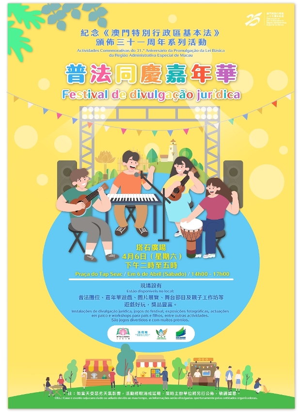 为纪念《中华人民共和国澳门特别行政区基本法》颁布三十一周年和庆祝澳门回归祖国二十五周年,澳门基本法推广协会、法务局、市政署和教育及青年发展局将于本周六(6日)下午二时至五时假塔石广场合办普法同庆嘉年华,活动内容丰富,让市民在欢庆的气氛下认识《澳门基本法》。