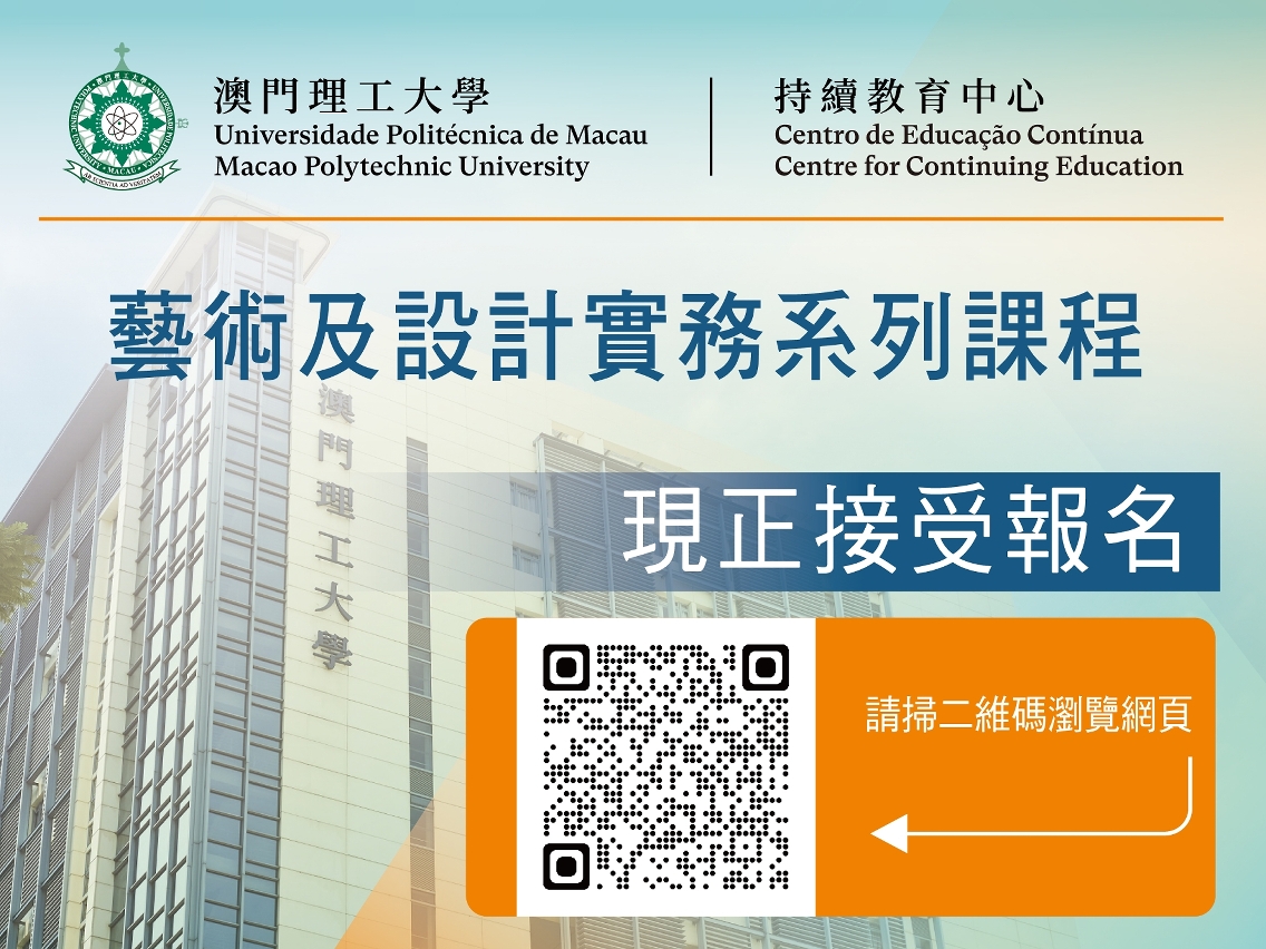 为助力澳门世界旅游休闲中心建设,推动综合旅游休闲产业提质发展,配合多元化文化盛事的人力资源需要,澳门理工大学持续教育中心将陆续增设艺术展览类课程,现正招生,欢迎从事或有志投身文化艺术、展览与创意产业相关行业发展的人士,以及对课程感兴趣者报读,额满即止。