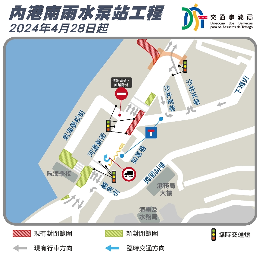 配合公共建设局继续推进“内港南雨水泵站及下水道工程”,于4月28日(周日)起,下环街与沙井地巷之间的一段河边新街、西湾湖景大马路近河边新街实施有限度通车;而航海学校街则实施封闭交通(详见附表)。