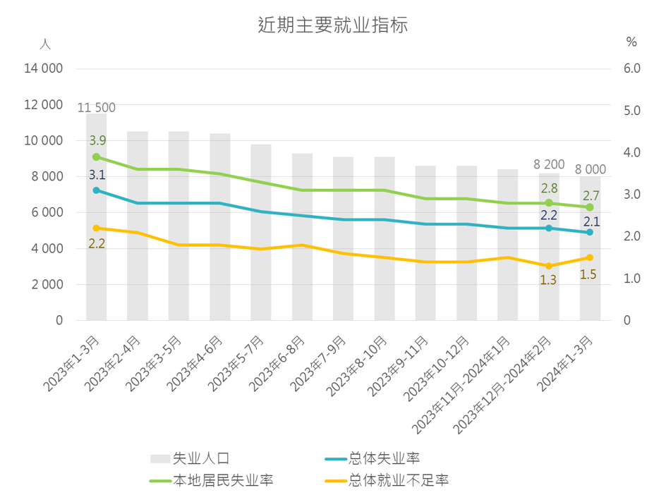 按三连月分析,今年1月至3月总体失业率(2.1%)及本地居民失业率(2.7%)均较上一期(2023年12月至2024年2月)下跌0.1个百分点,就业不足率(1.5%)上升0.2个百分点。就业人口(37.11万人)较上一期增加300人,本地就业居民(28.40万人)则减少300人。