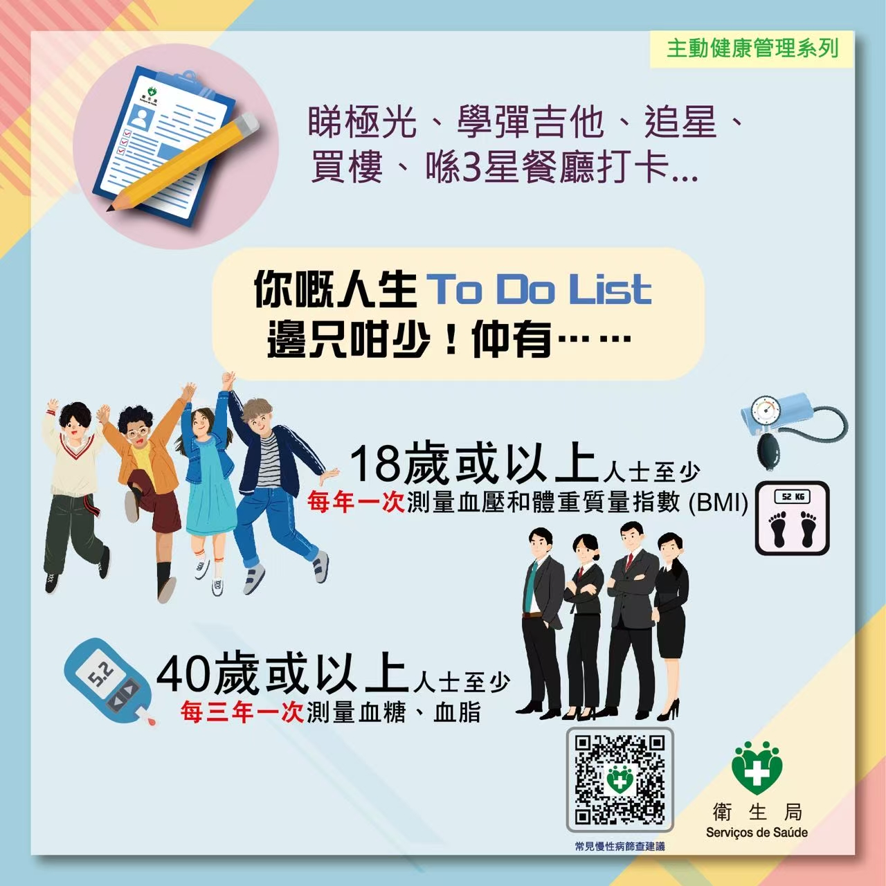 卫生局秉持“预防优先,妥善医疗”的理念,透过制定健康政策、创设健康环境和促进个人健康行为,以达致构建健康澳门的目标。为唤起居民关注血压问题、加强主动管理自己健康,尤其提升年轻族群对测量血压的关注度,并配合“世界高血压日”于5月17日举办“5.17血压齐齐check”活动,具体如下: