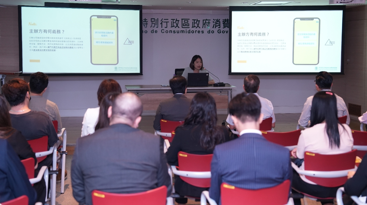 按《消保法》规定,在本澳举行的展销或展览的销售活动,主办实体须于活动开始前至少两个工作日,向消委会提供活动举行地点、开始及结束日期,以及参展商的认别资料、地址及联络方法。消委会月前推出“展销或展览的销售活动通报”网上服务,为让业界更有效使用服务,消委会举办讲解会,向业界介绍该服务简易及便捷等优点。