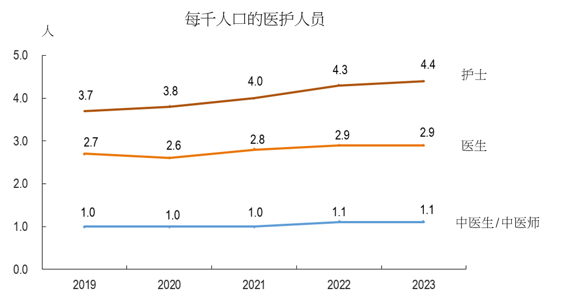 统计暨普查局资料显示, 2023年末本澳注册医生(1,980名)、中医生/中医师(728名)及护士(2,980名)按年分别增加15名、4名及117名;相当于每千人口对应2.9名医生(按年持平)、1.1名中医生/中医师(按年持平)及4.4名护士(按年增加0.1名)。