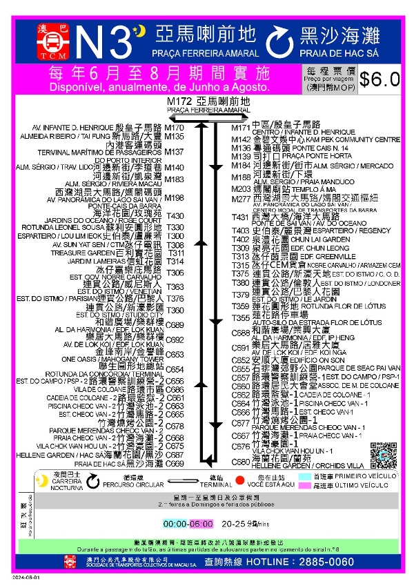 暑期将至,N3路线由2024年6月1日至8月31日期间,延长服务行程至黑沙海滩。详情可查阅澳巴网页 http://www.tcm.com.mo 。