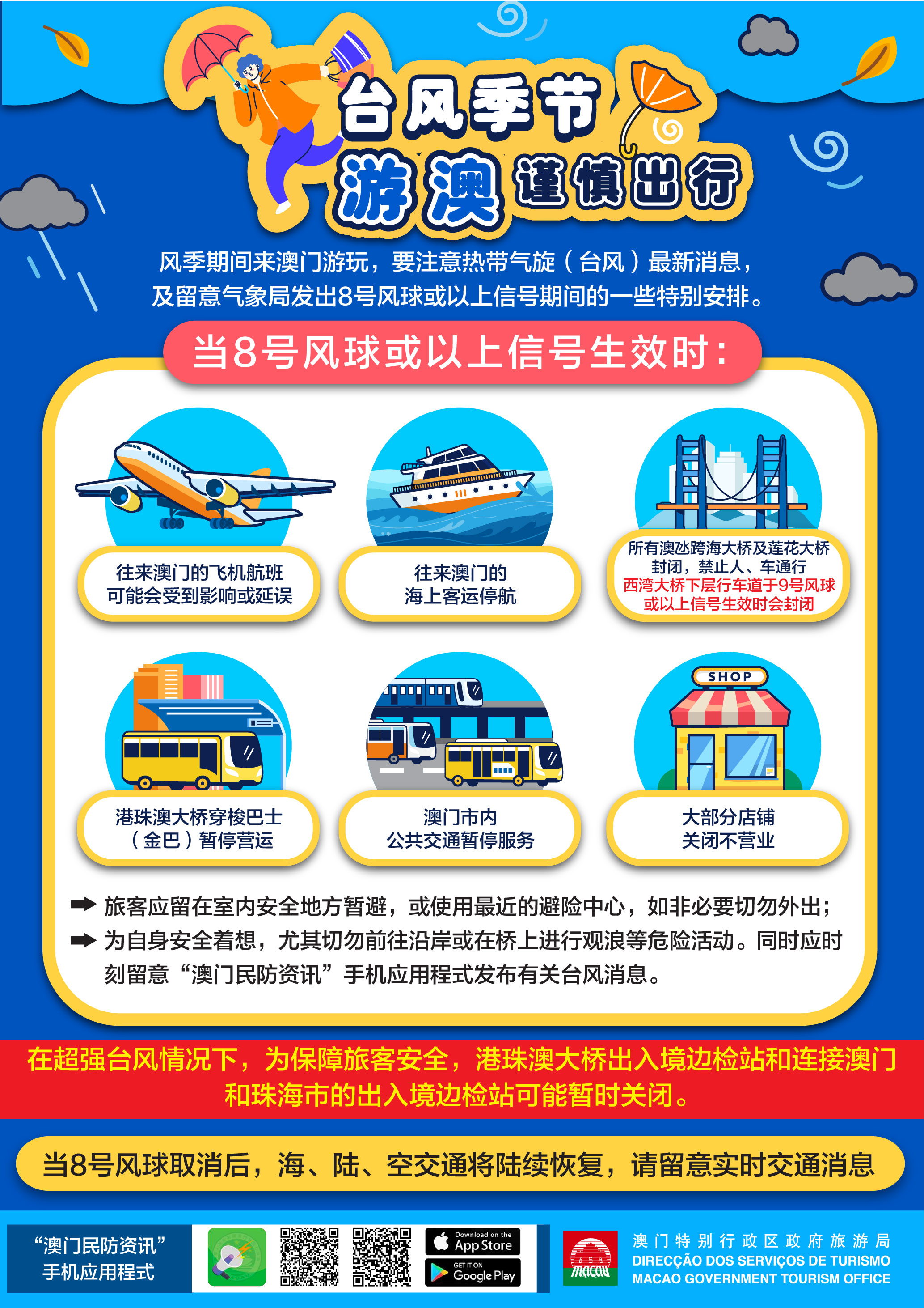 旅游局各旅客询问处已于显眼位置展示台风信息,并透过4间电讯公司向在澳旅客及在外地旅游的澳门居民发放民防信息。旅游热线(2833 3000)24小时运作。