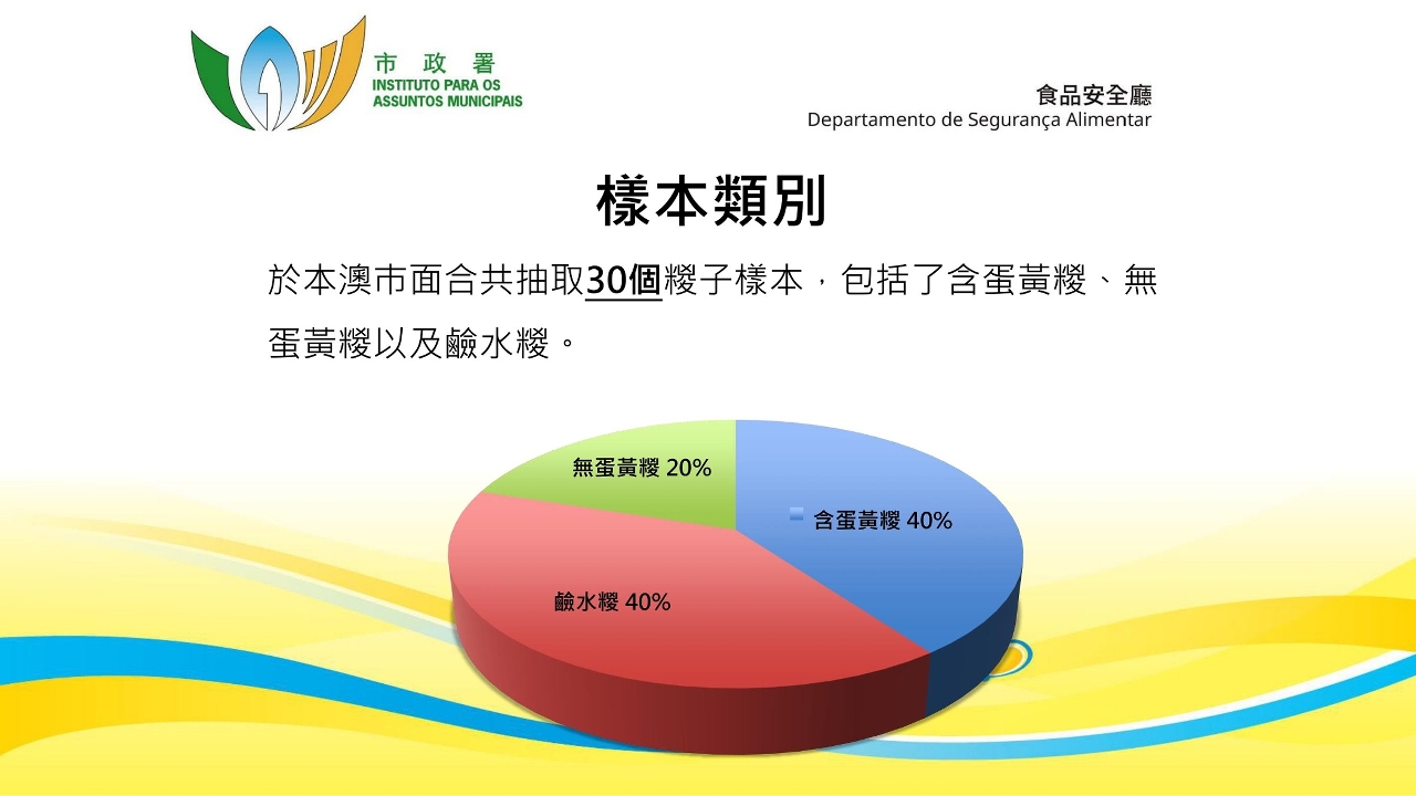 本次抽检的糉子样本共三十个,包括含蛋黄糉、无蛋黄糉及碱水糉,所有样本均进行了微生物与化学检测。其中,微生物检测项目包括沙门氏菌、金黄色葡萄球菌、蠟样芽孢杆菌,并因应碱水糉及含蛋黄糉的制作特点,分别加验硼酸和苏丹红的化学检测项目。所有样本的检测结果均未见异常。