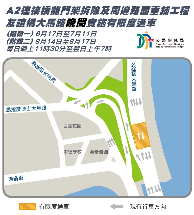 配合公共建设局A2连接桥龙门架拆除及周边路面重铺工程,自6月17日起友谊桥大马路将分阶段于晚上11时30分至翌日早上7时实施有限度通车(详情请查询附表)。期间,巴士服务不受影响。